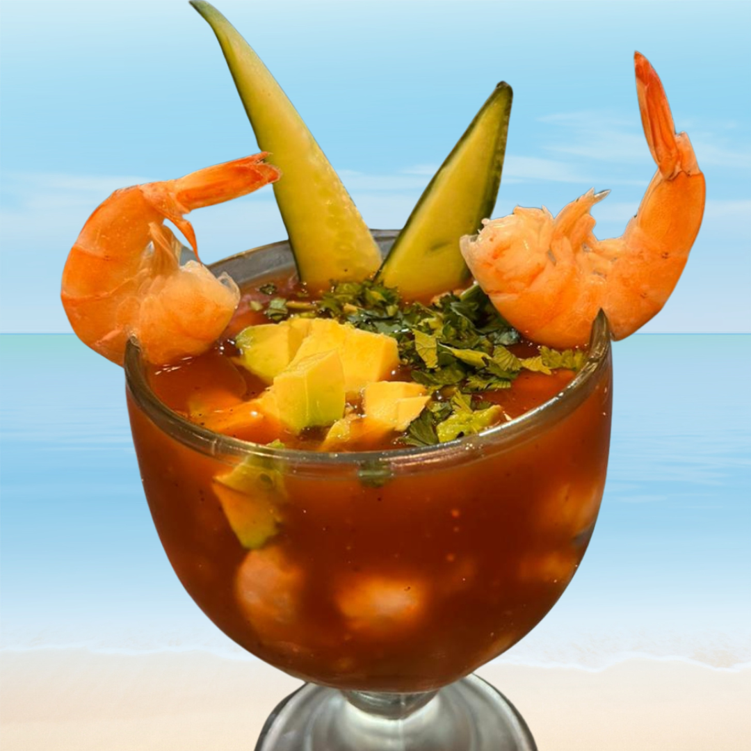 Camarón, pepino, cebolla morada, tomate, cilantro, clamato 220 gr
