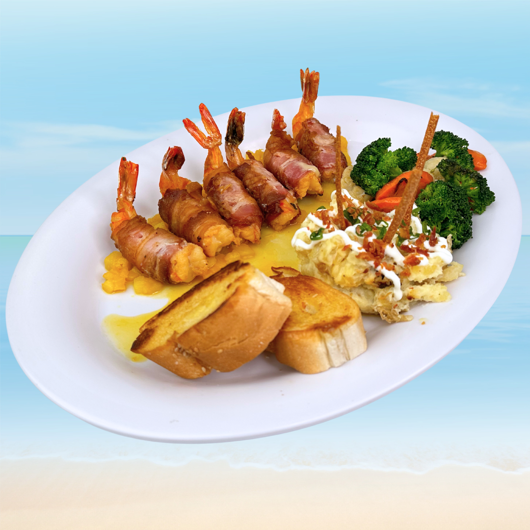 6 Camarones rellenos de queso chihuahua y envueltos en tocino, con salsa de piña 180g