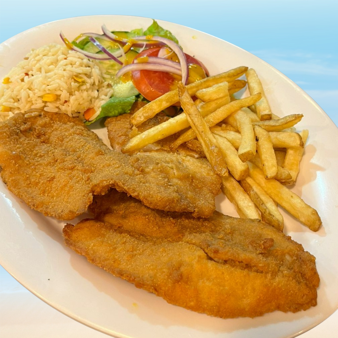 Filete empanizado, acompañado de papas francesas, ensalada y arroz. 220 gr