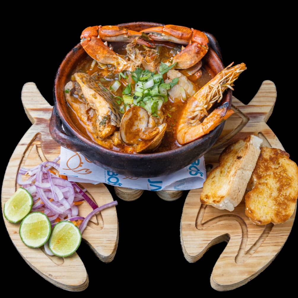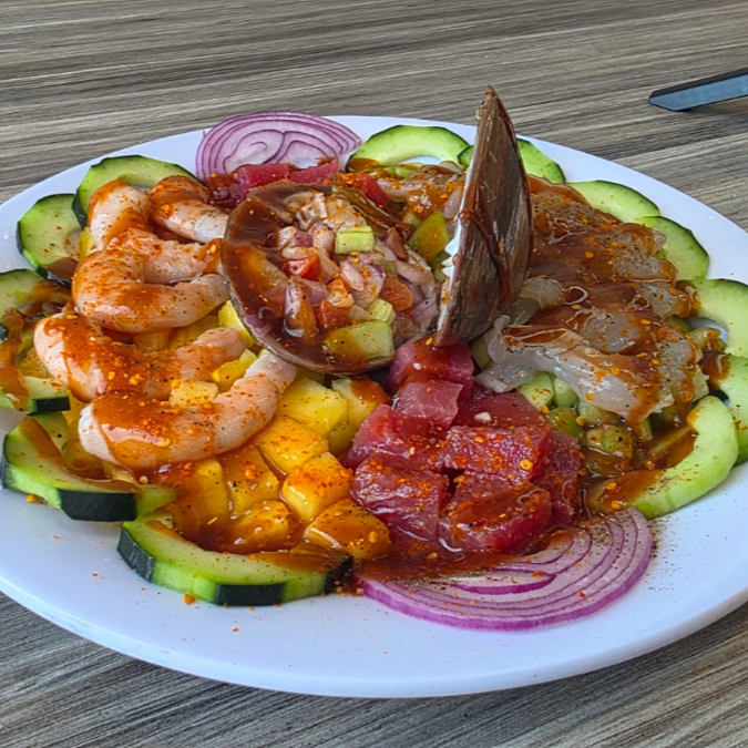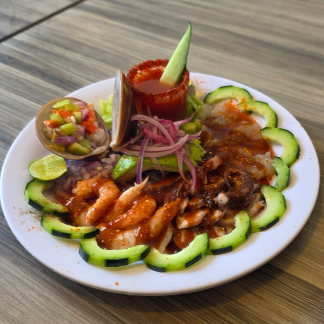 Aguachile y camaron cocido, almeja, pulpo, pepino, piña, con shot de sangre de cristo, salsa negras y salsa balazo 160g