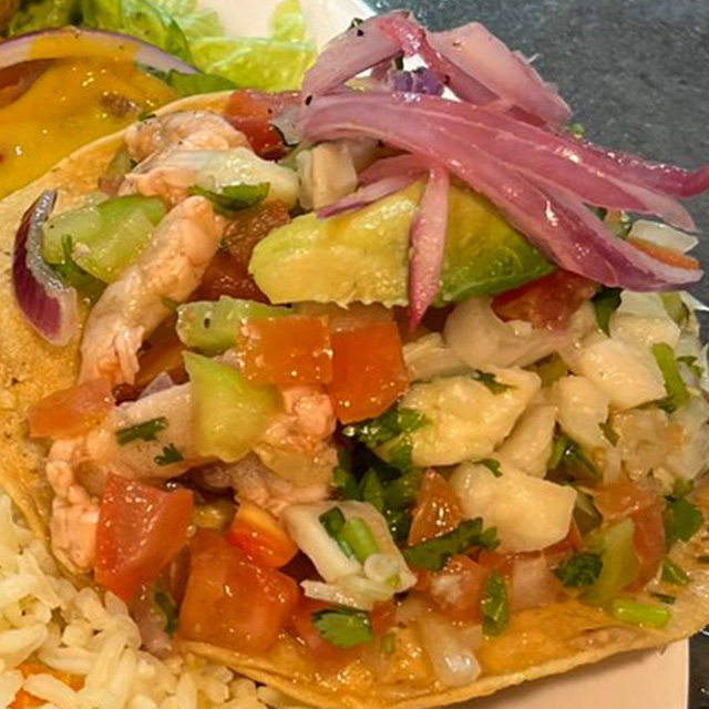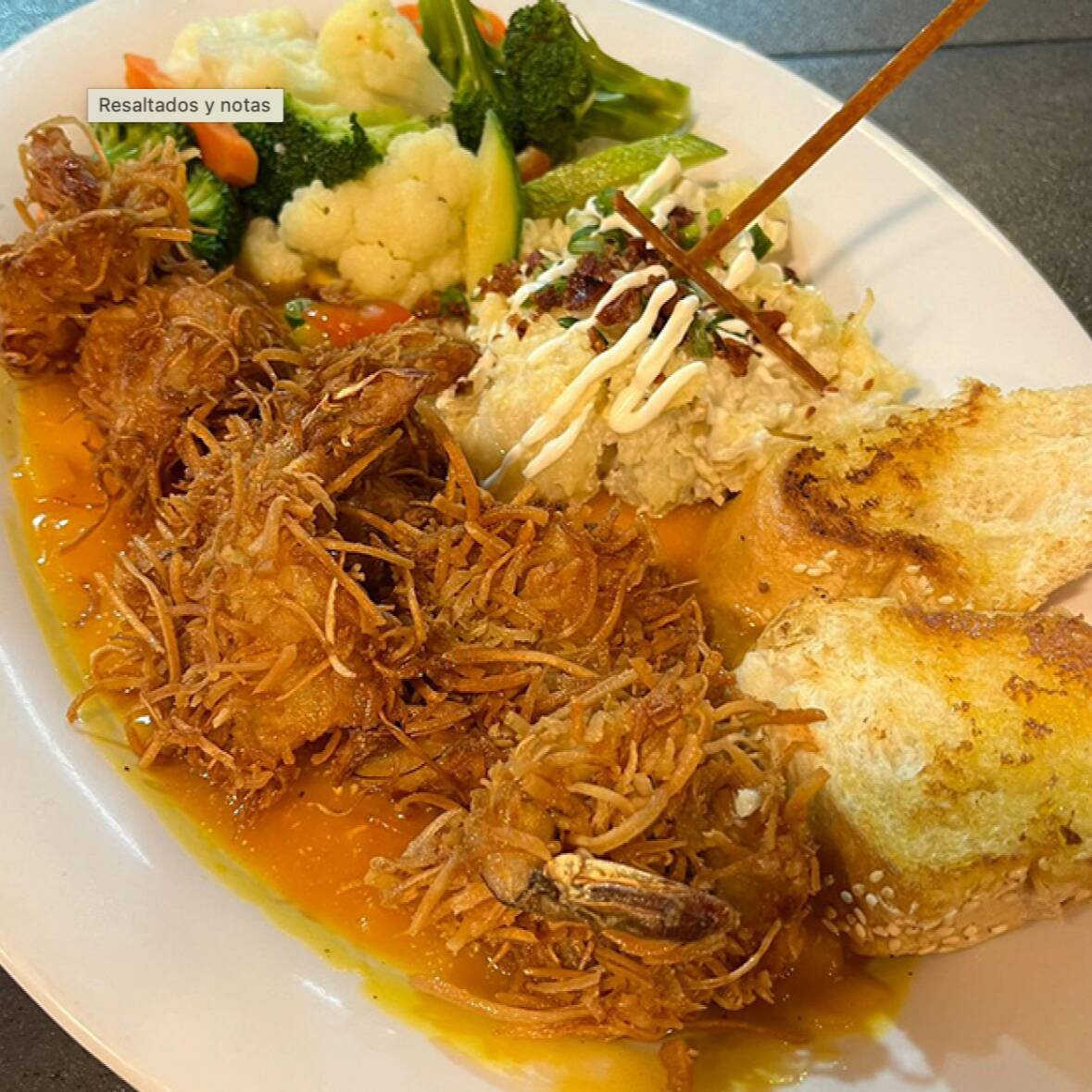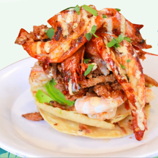 Camarones, pescado en chicharron, queso, guisado gobernador y tortilla de harina dorada con aderezo 140g