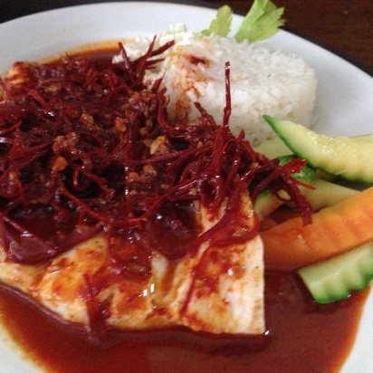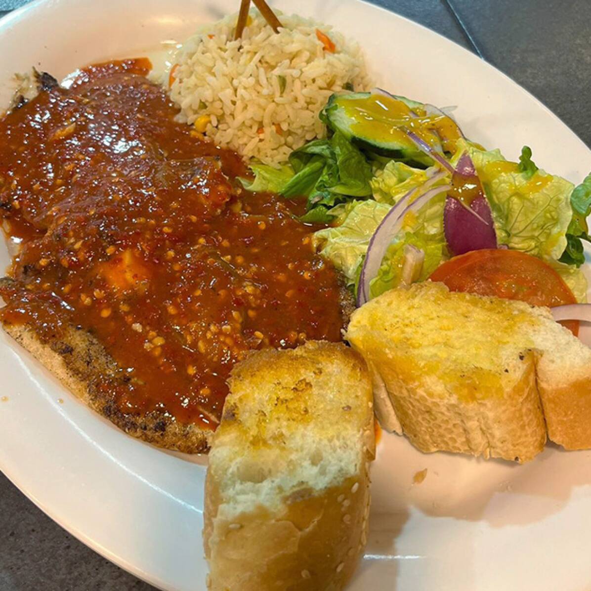 Mojarra frita, bañada a la diabla, acompañada de arroz, ensalada y papas cambray.