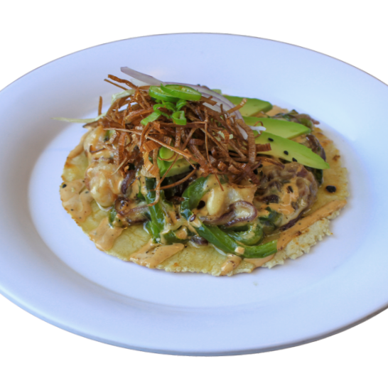 Camarones rancheros con pimientos, queso gratinado y pimientos, queso gratinado y pimientos, queso gratinado y aguacate 100g