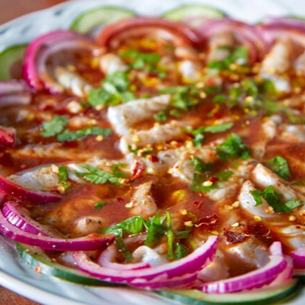 Pulpo, camarones y atun a las brasas con piña, pepino, cebolla, limon, salsas negras, chiltepin y callo 150g
