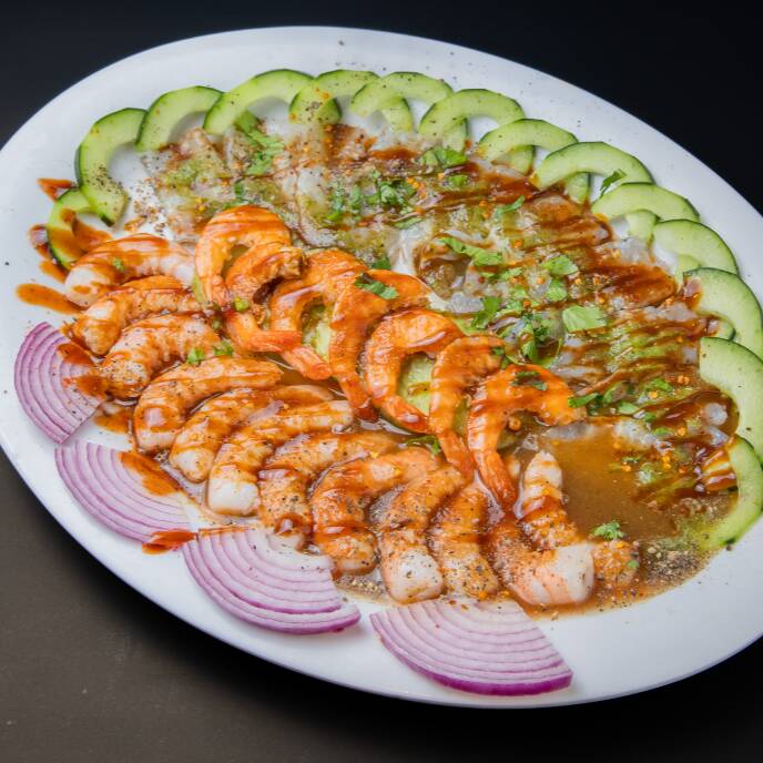 Camarón mariposa, pepino, cebolla morada, limón, bañado de salsa de chile serrano 180gr
