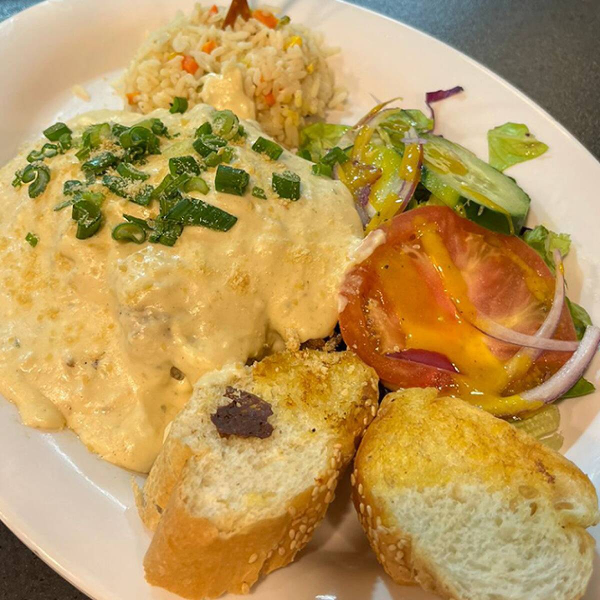 Bañado de salsa poblana, gratinado, acompañado de arroz al ajillo y ensalada 220g