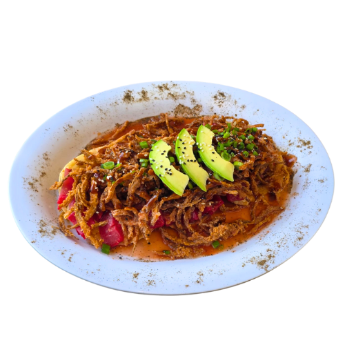 Laminas de atun sobre dos tostadas, aderezo de chipotle, coronado con cebolla frita y bañada de salsa negras 100g