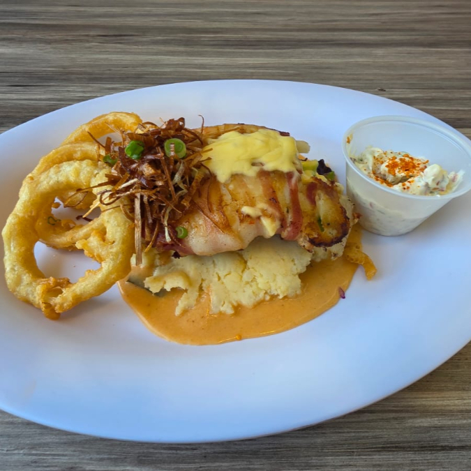 Filete relleno de champiñones, rajas y queso envuelto con tocino, montado sobre pure, salsa chipotle, acompañado de brocoli y aros de cebolla 220g