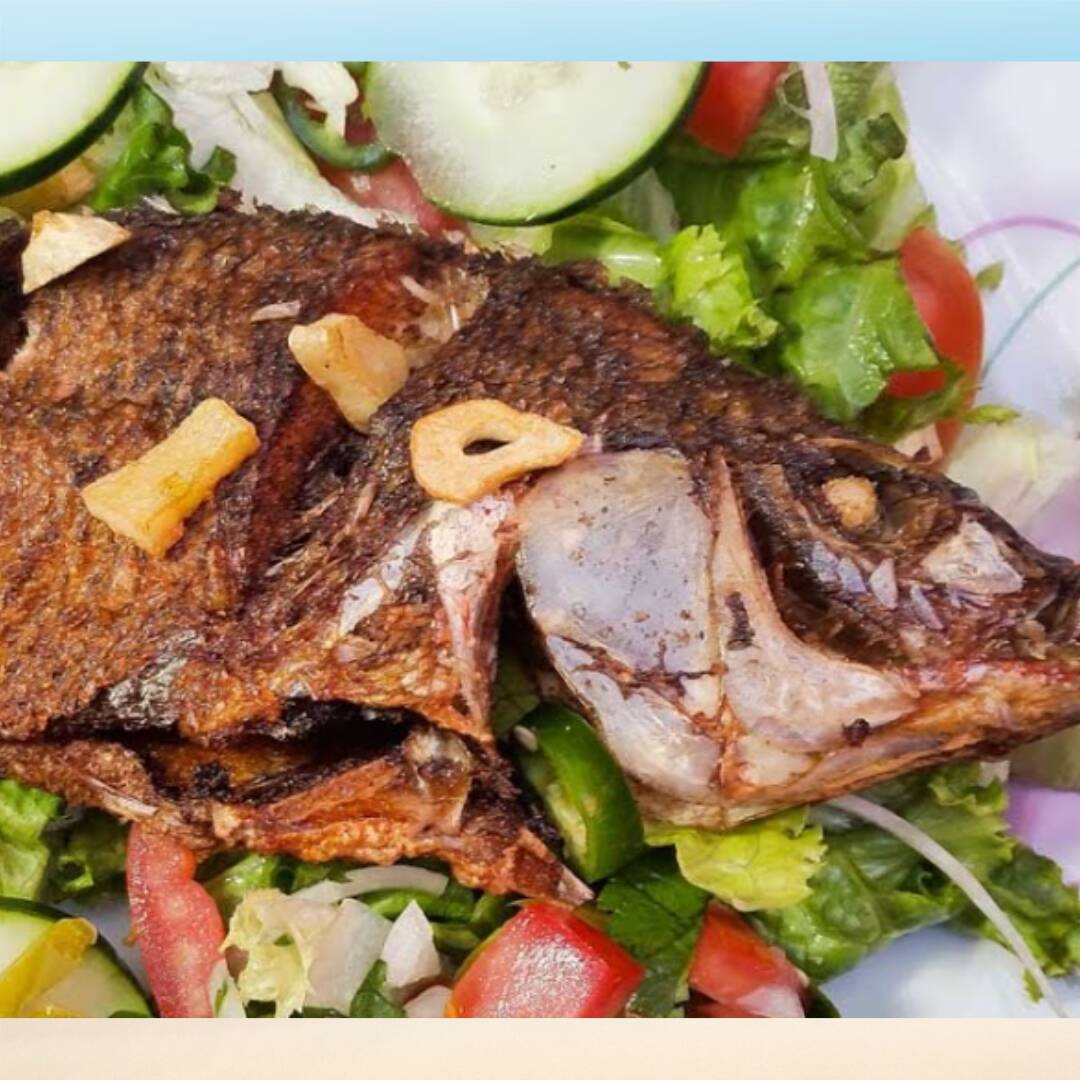 Mojarra frita, bañada al ajillo, acompañada de arroz, ensalada y papas cambray.