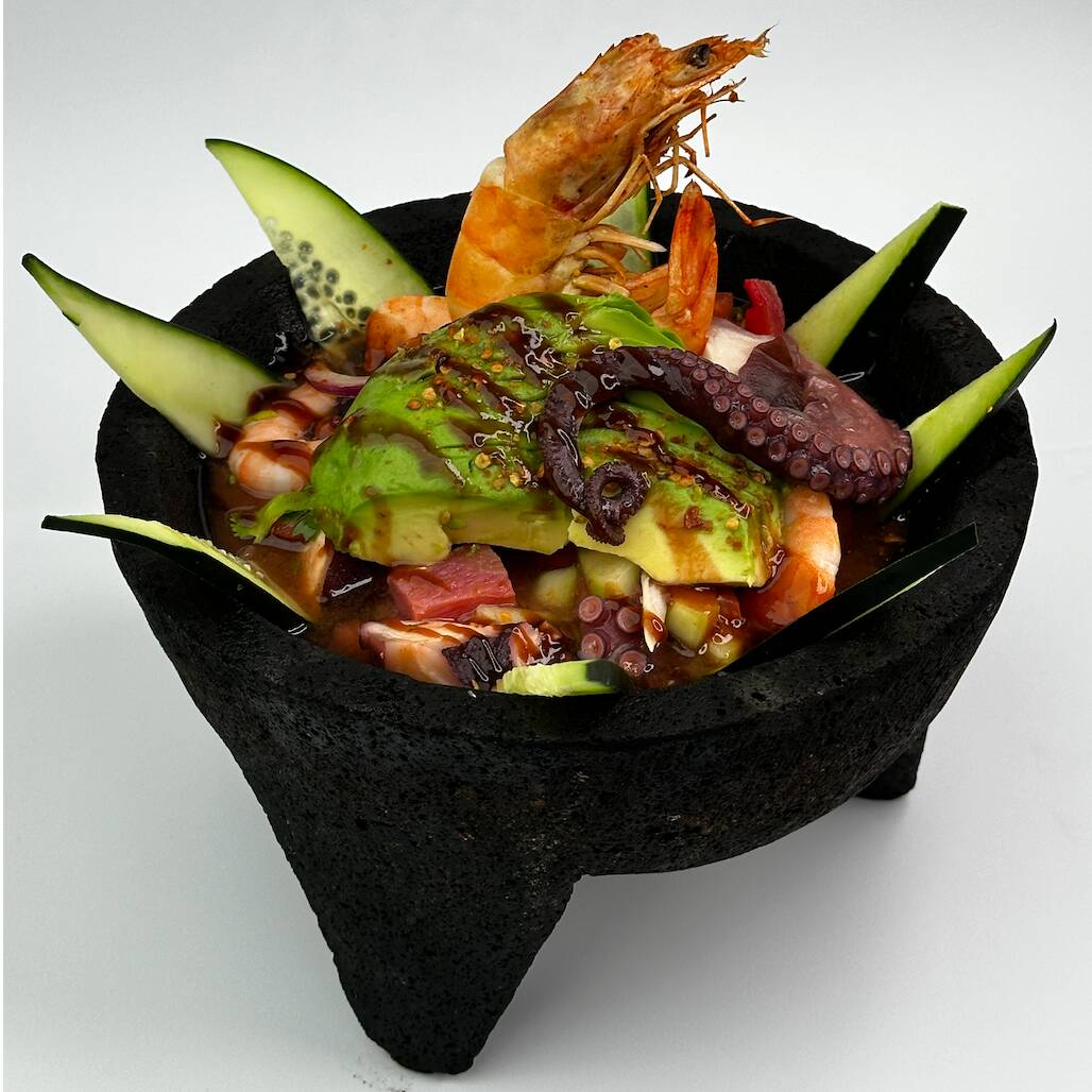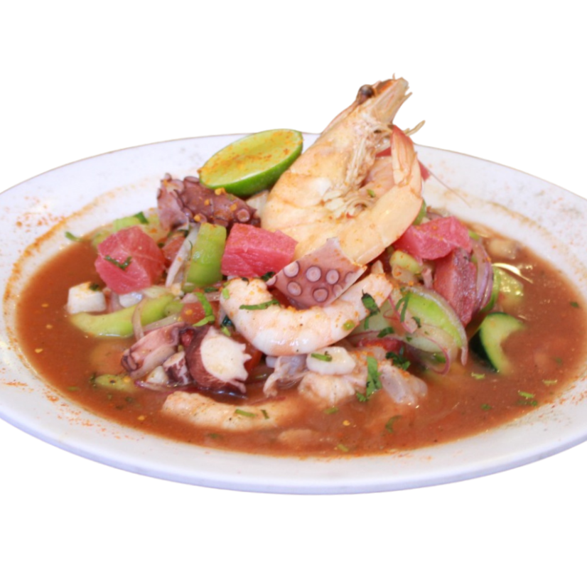 Cmaraon cocido, pulpo, atun, aguacate, pepino, cebolla morada, tomate, clamato y salsa jaibo 200g