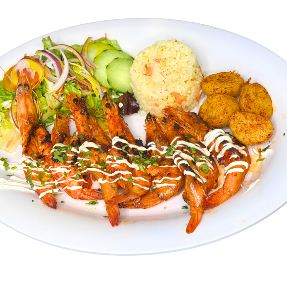 Bañada con camaron, pulpo, surimi, aros de cebolla al ajillo, arroz, ensalada y papa cambray