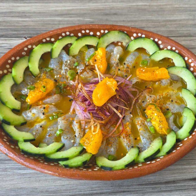 Camaron aguachile con salsa de mandarina y serrano, con pepino, cebolla y limon 150g