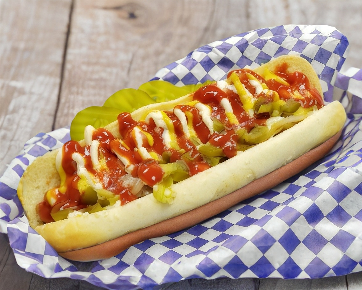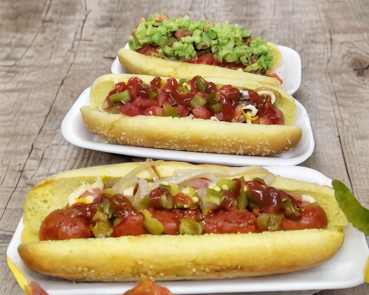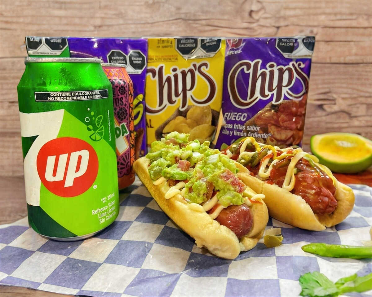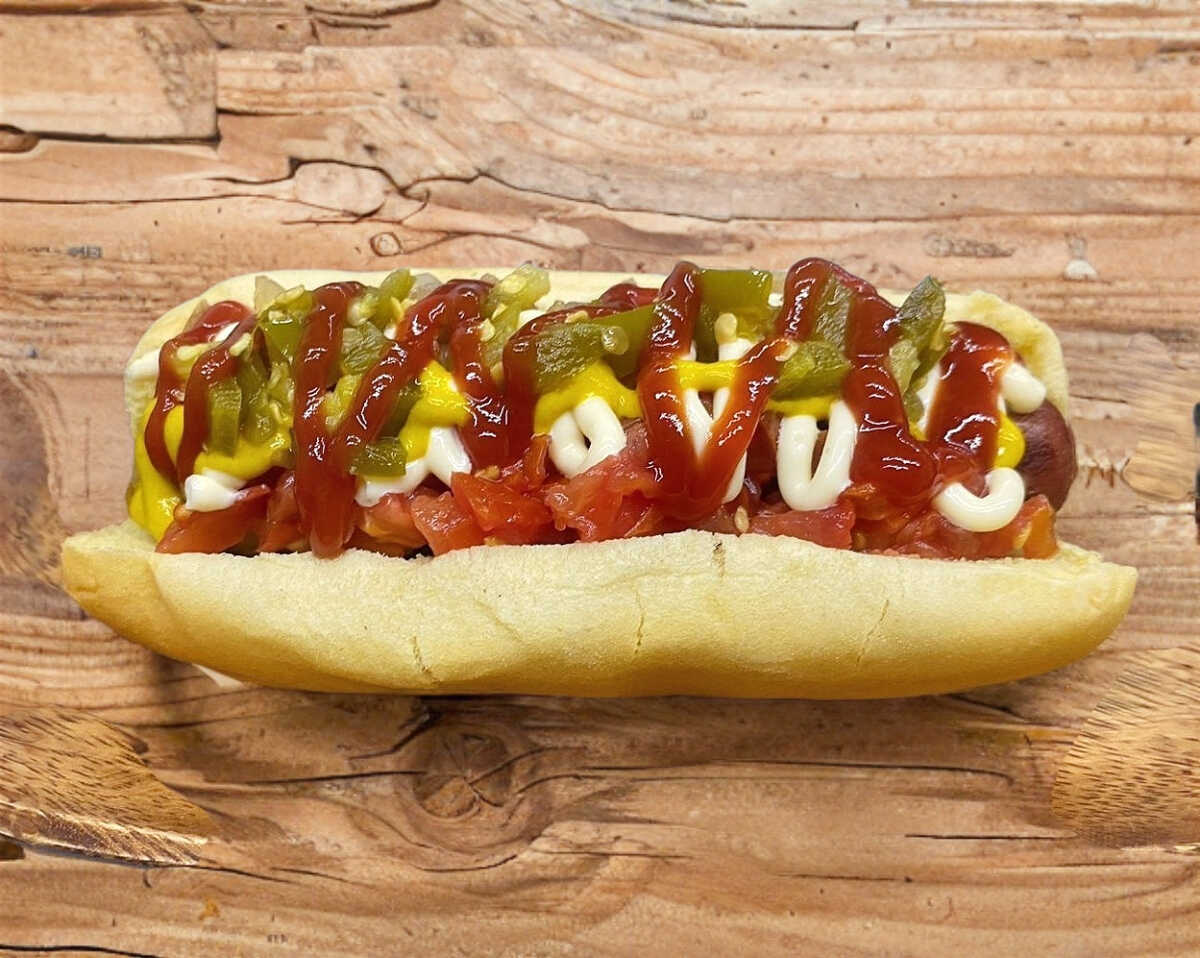 Pan wonder, salchicha de pavo jumbo, tomate, cebolla asada o cruda, jalapeño picado, mayonesa, mostaza y salsa cátsup.