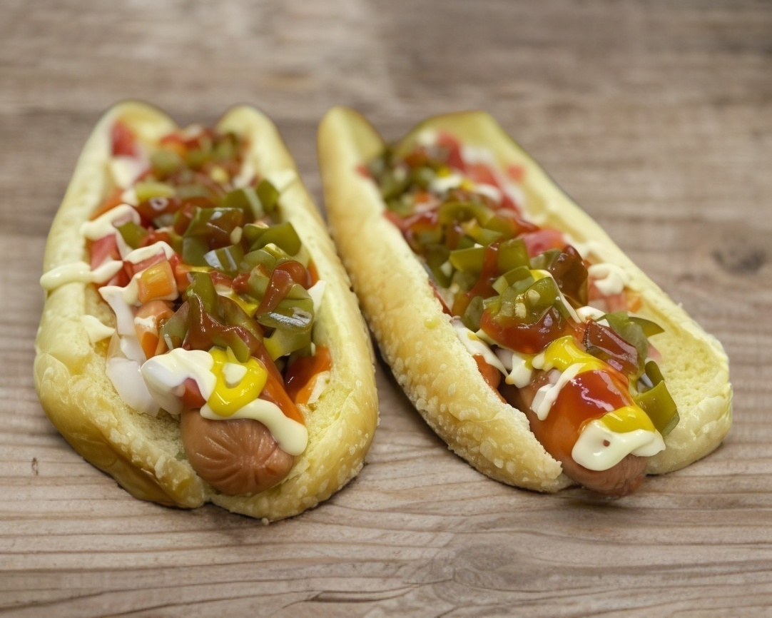 Pan media noche, salchicha de pavo, tomate, cebolla asada o cruda (picada), jalapeño (picado), mayonesa, mostaza y salsa Cátsup.