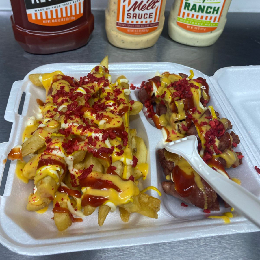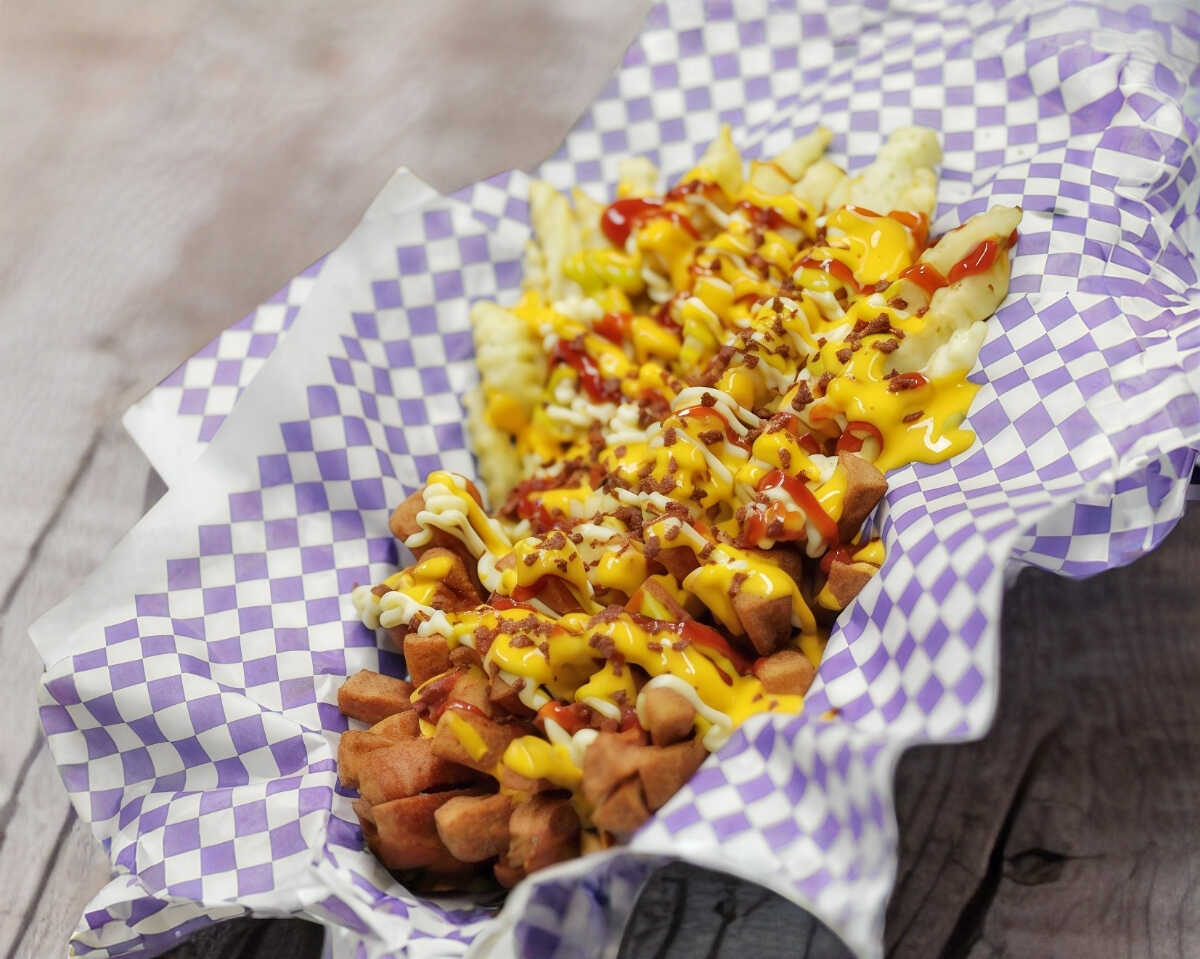 Papas fritas acompañadas de trozos de salchicha de pavo en forma de pulpo, bañadas en mayonesa, mostaza, cátsup, queso amarillo y tocino deshidratado.