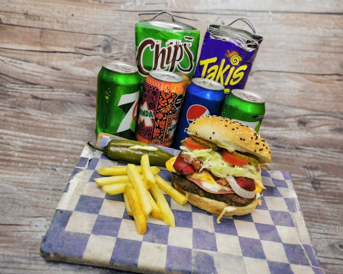 Doble carne de arrachera, doble jamón, doble queso amarillo, tocino, cebolla asada, tomate, lechuga, aguacate, pepinillos, mayonesa, mostaza, salsa cátsup. chile jalapeño relleno de queso.
