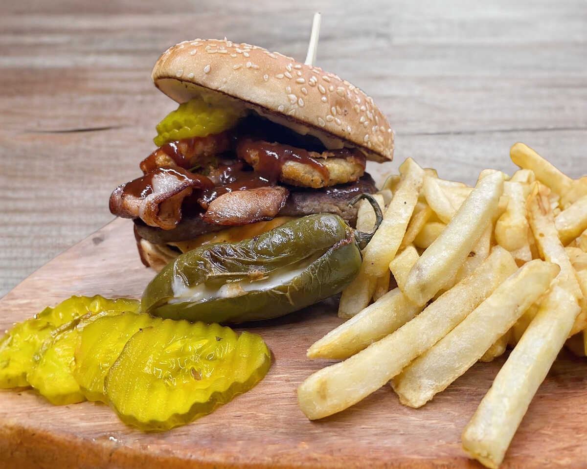 Deliciosa carne de arrachera, queso americano, tocino, crujientes aros de cebolla, pepinillos y aderezos. Acompañada de un chile jalapeño relleno de queso oaxaca