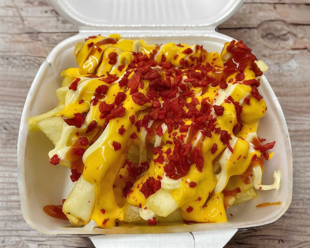 Deliciosas papas a la francesa preparadas con mayonesa, mostaza, salsa cátsup, queso y tocino deshidratado en trocitos.