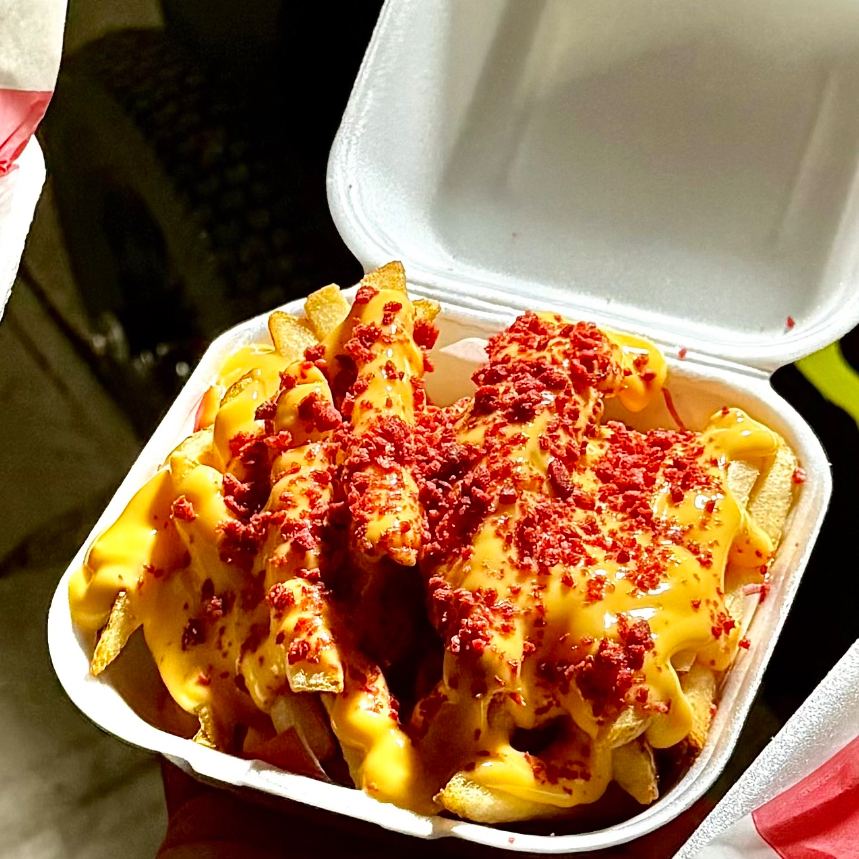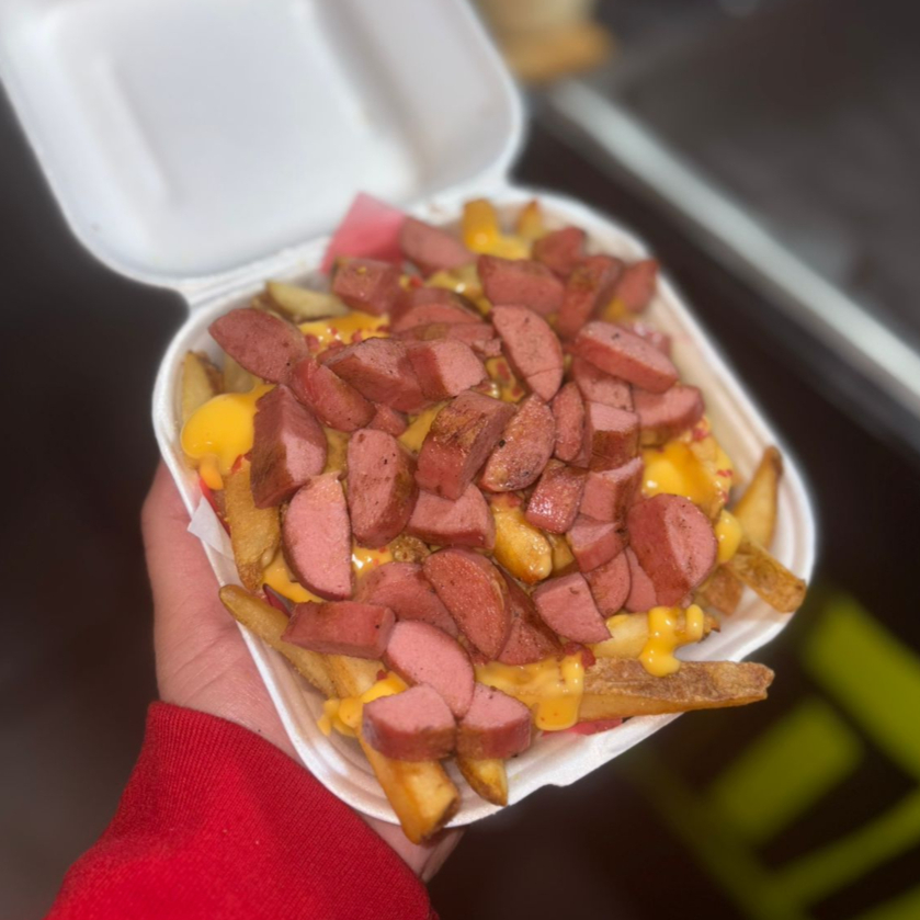 Papas doradas con trozos de salchicha, bañadas en queso amarillo y espolvoreadas con tocino deshidratado, sal y pimienta limón. ¡La mezcla perfecta de sabor y antojo!