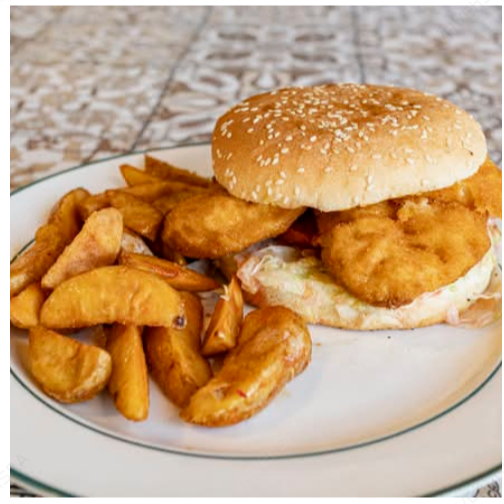 Hamburguesa con pollo empanizado, cebolla, lechuga, tomate, mostaza y mayonesa.