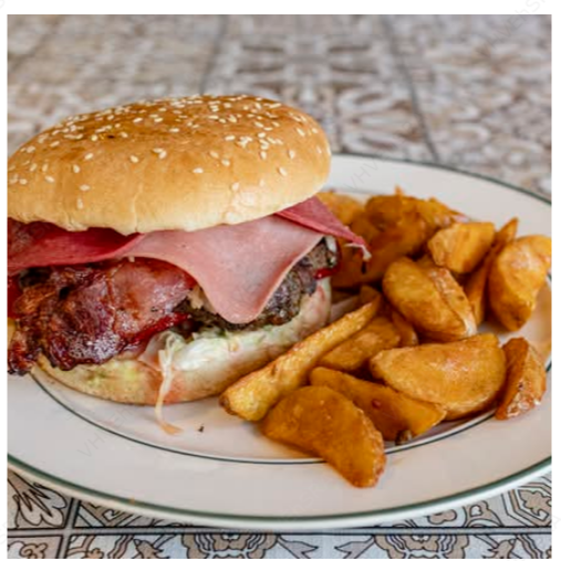 Carne, queso manchego, jamón, tocino, lechuga, tomate, cebolla, aderezos