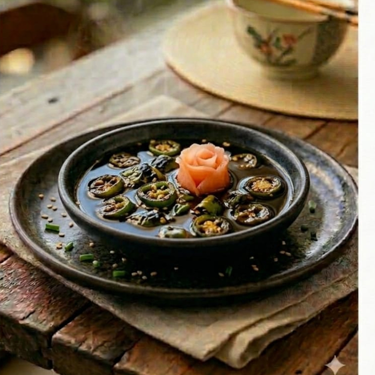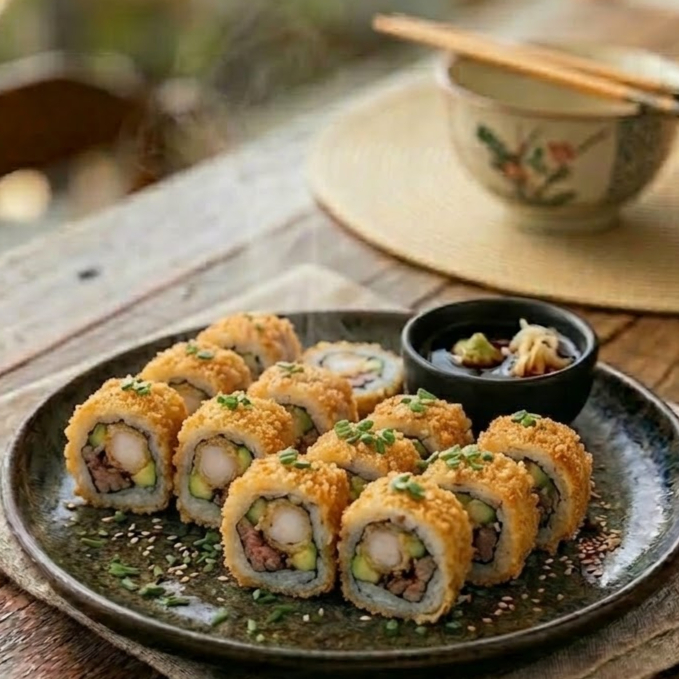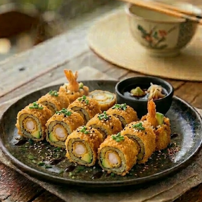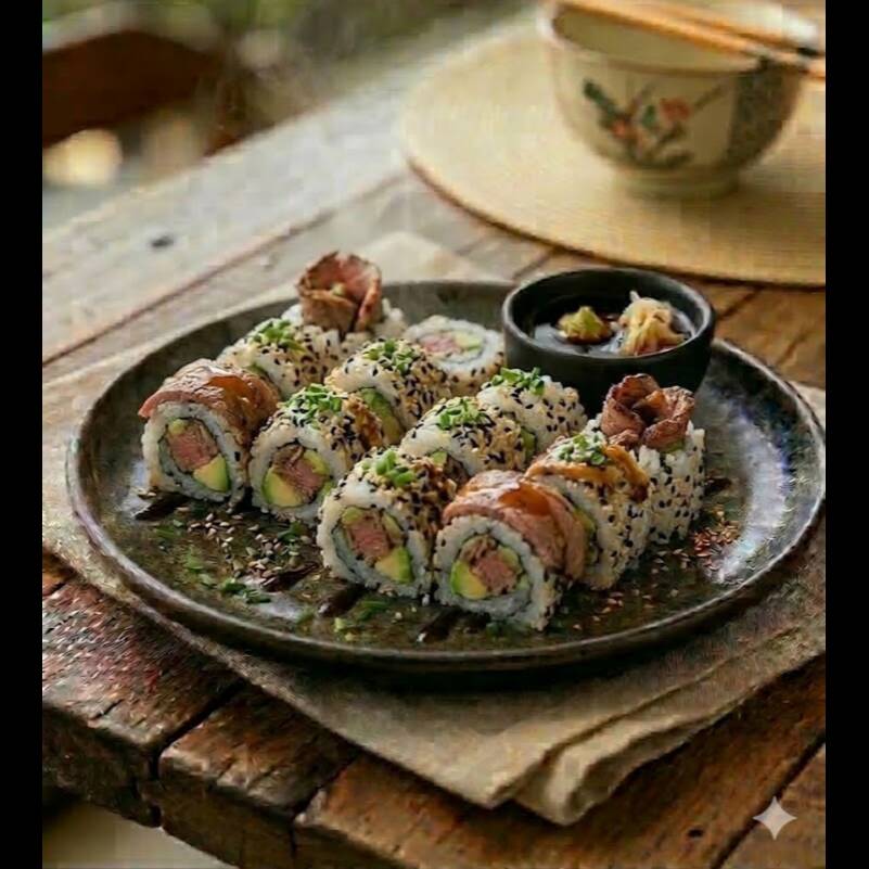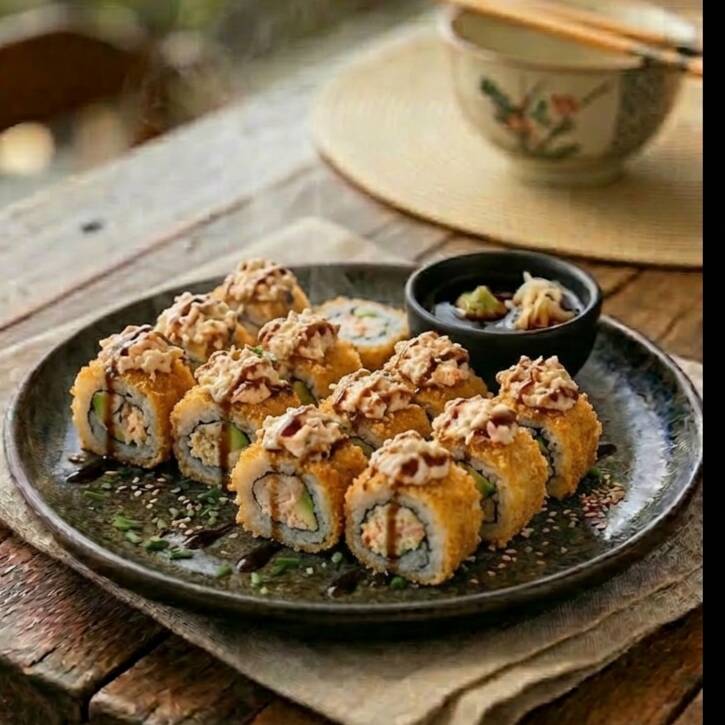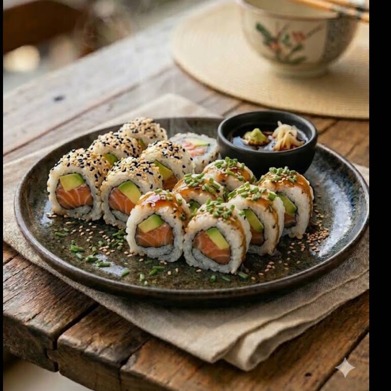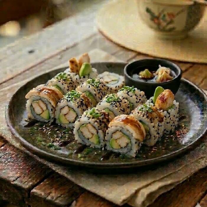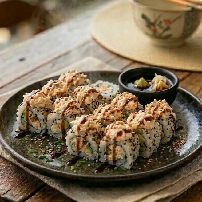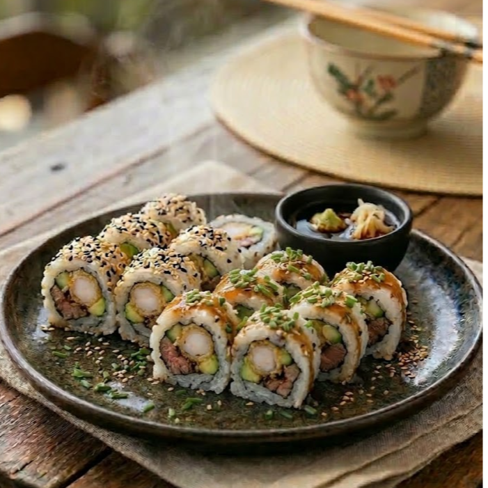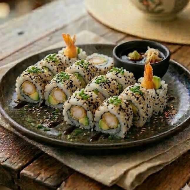 Camarón, pepino, queso crema, aguacate, salsa tampico por fuera bañado de salsa teriyaki.