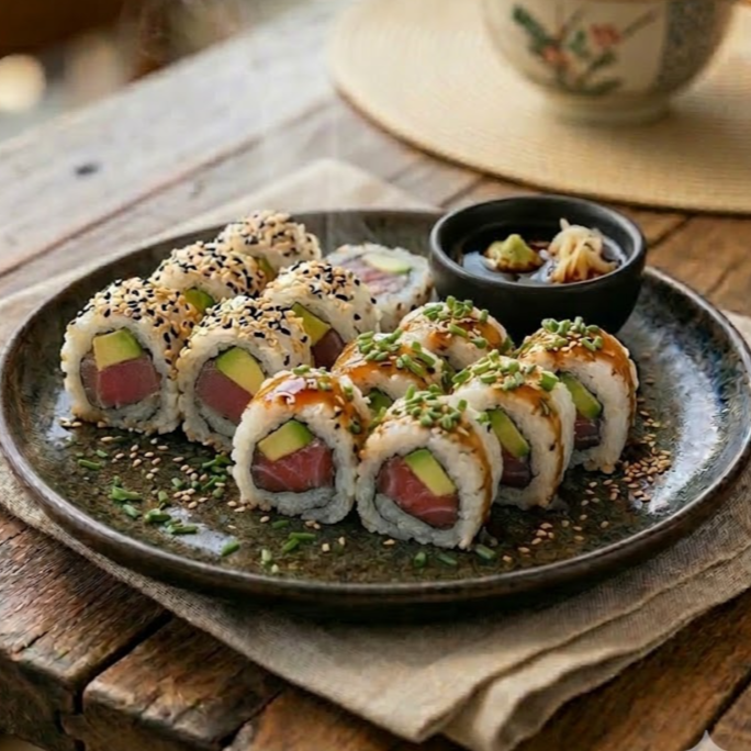 Atún, pepino, queso crema, aguacate.