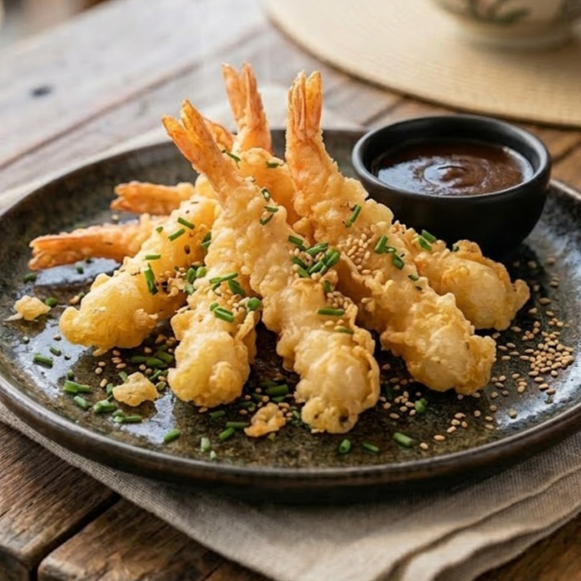 Camarones estilo tempura, crujientes acompañados de la salsa de la casa.