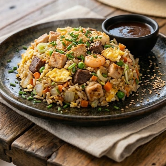 Arroz frito con verduras y de tu elección pollo, res o camarón.