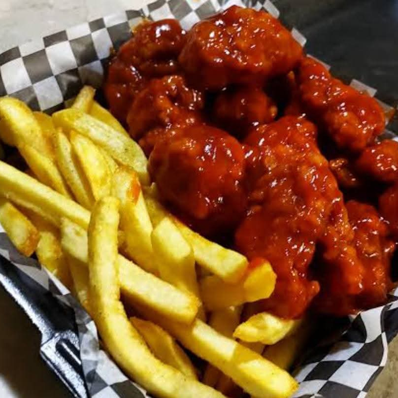 6 boneless de 25 gr cada uno bañados en una salsa de su elección, acompañados de papas a la francesa (120 g) sazonadas y una bebida.