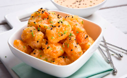 Arroz de sushi, alga nori, queso philadelphia, camarón picante en tempura, aguacate y cebollín, por fuera en tempura, con aderezo de mostaza dulce, sriracha y de topping zanahoria frita (se acompaña con soja con limón, salsa de anguila y/o chiles toreados).