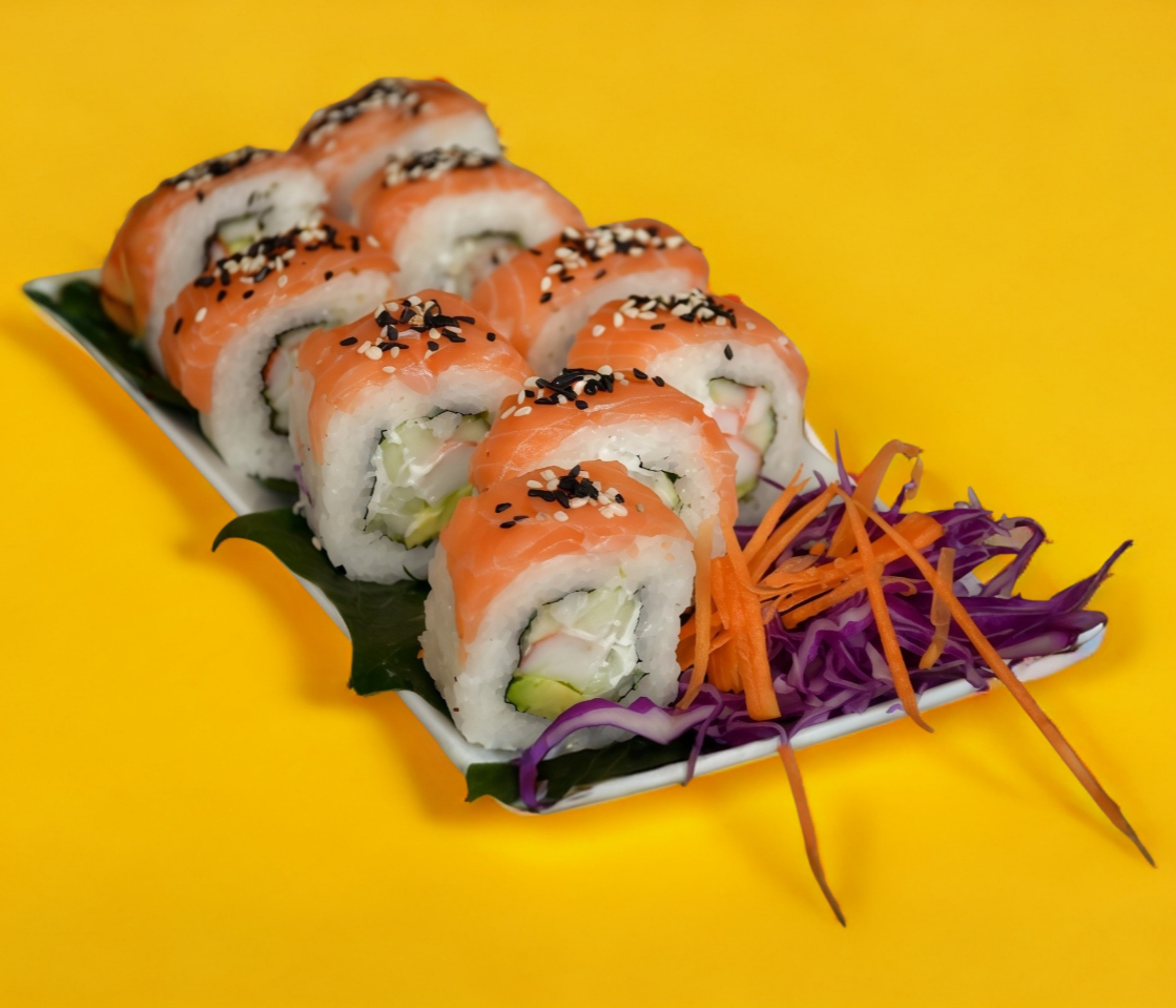 Rollo de alga por fuera, relleno de salmón, surimi, camarón y pepino.