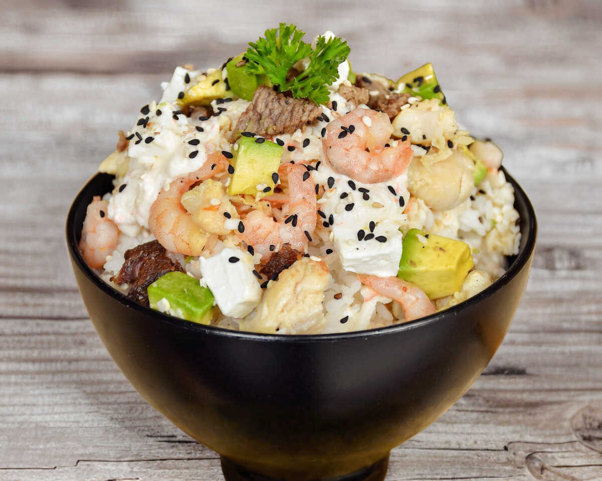 Arroz blanco al vapor con pollo, camarón, filete, pasta tampico, queso crema y aguacate.