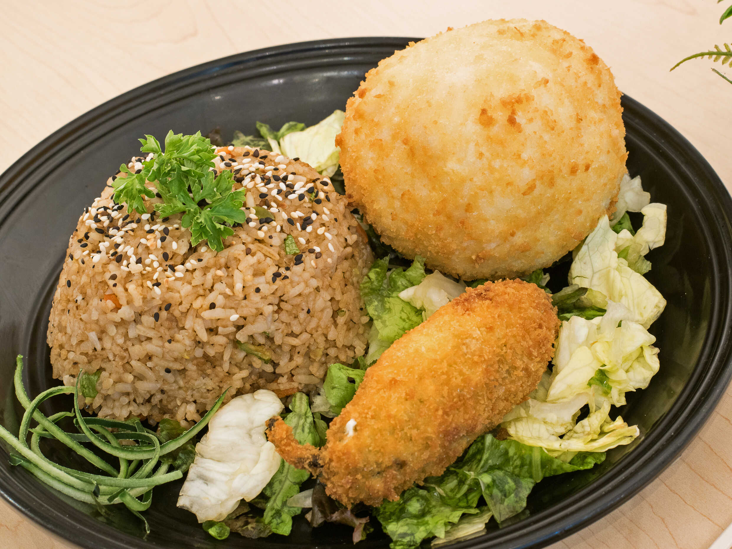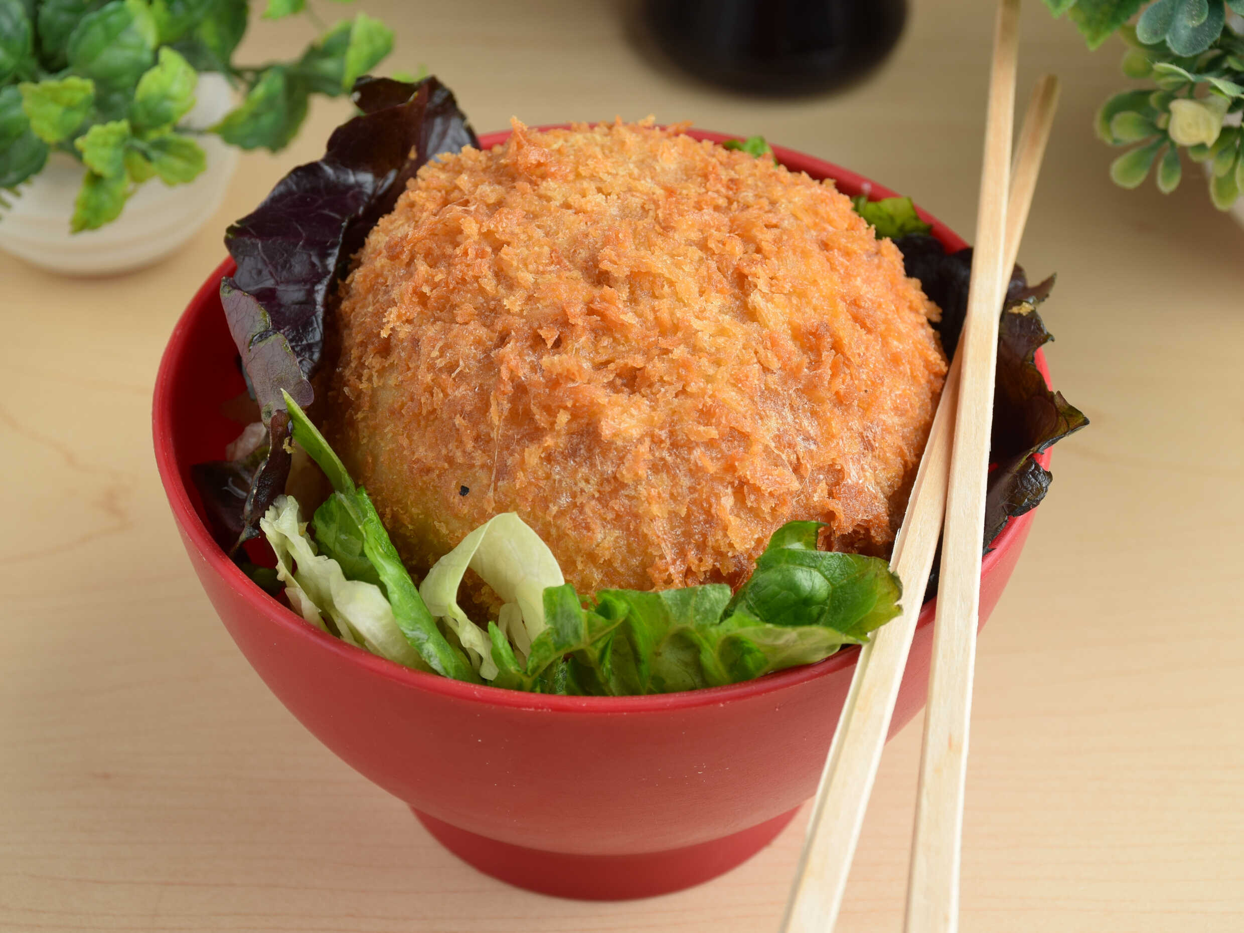 Verduras tempura bañadas en salsa spicy y kushiage sobre una cama de lechuga y ajonjolí.
