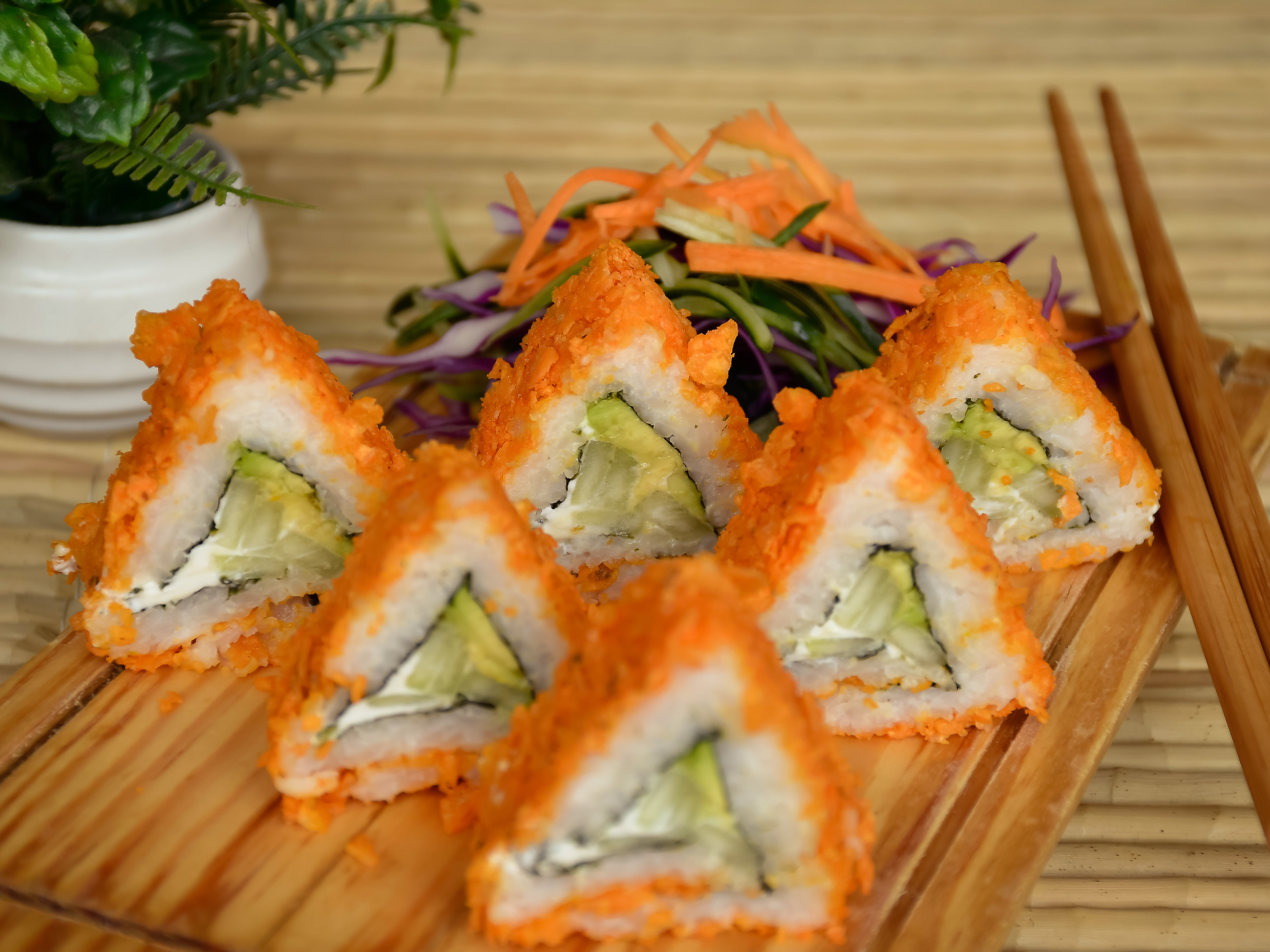 Rollo vegetariano, queso crema, aguacate, pepino empanizado con Doritos, puedes pedir tambien con Ruffles o Flaming Hot.