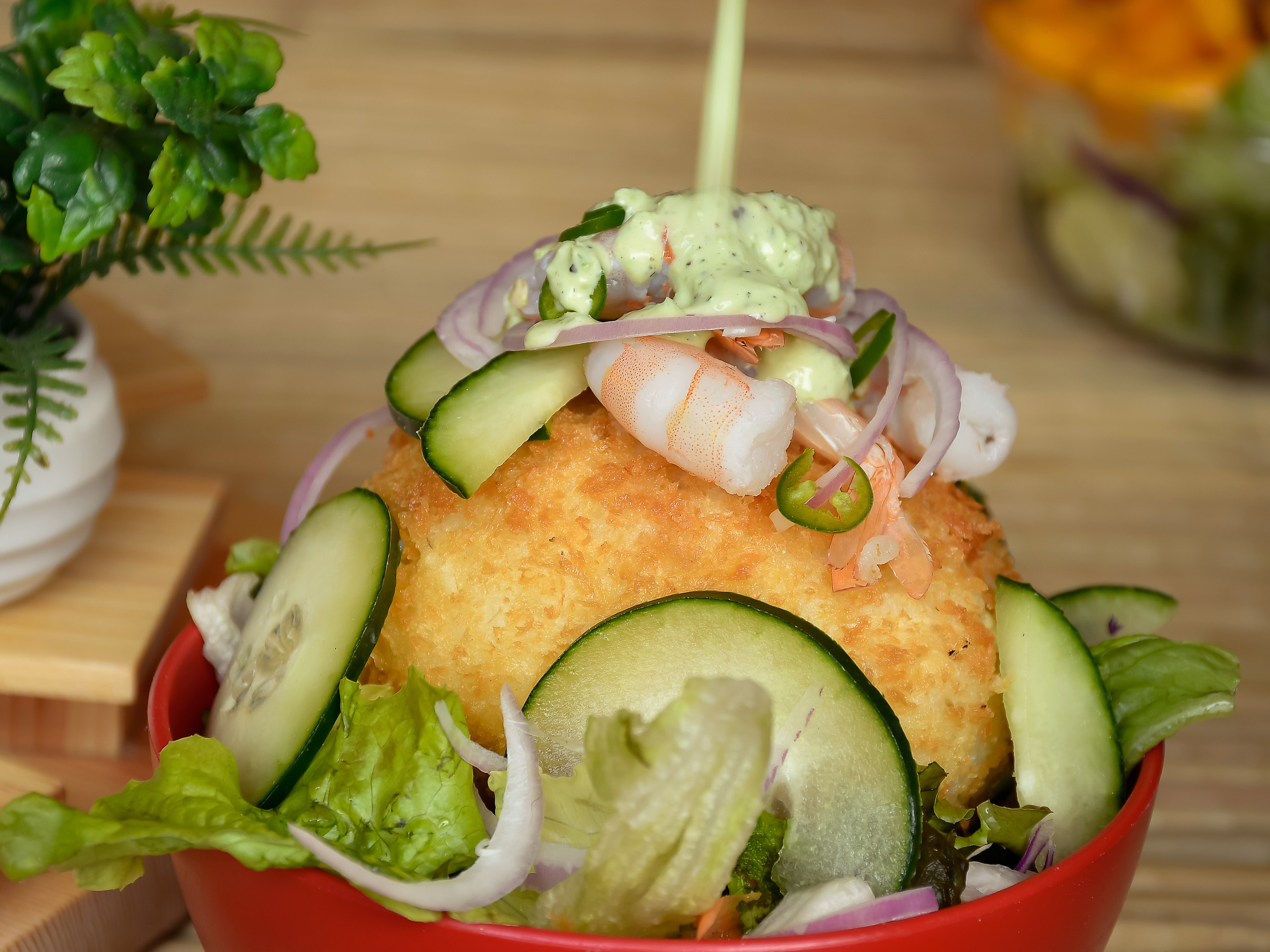 Lechuga, zanahoria picante rallada, camarones empanizados bañados en salsa búfalo.