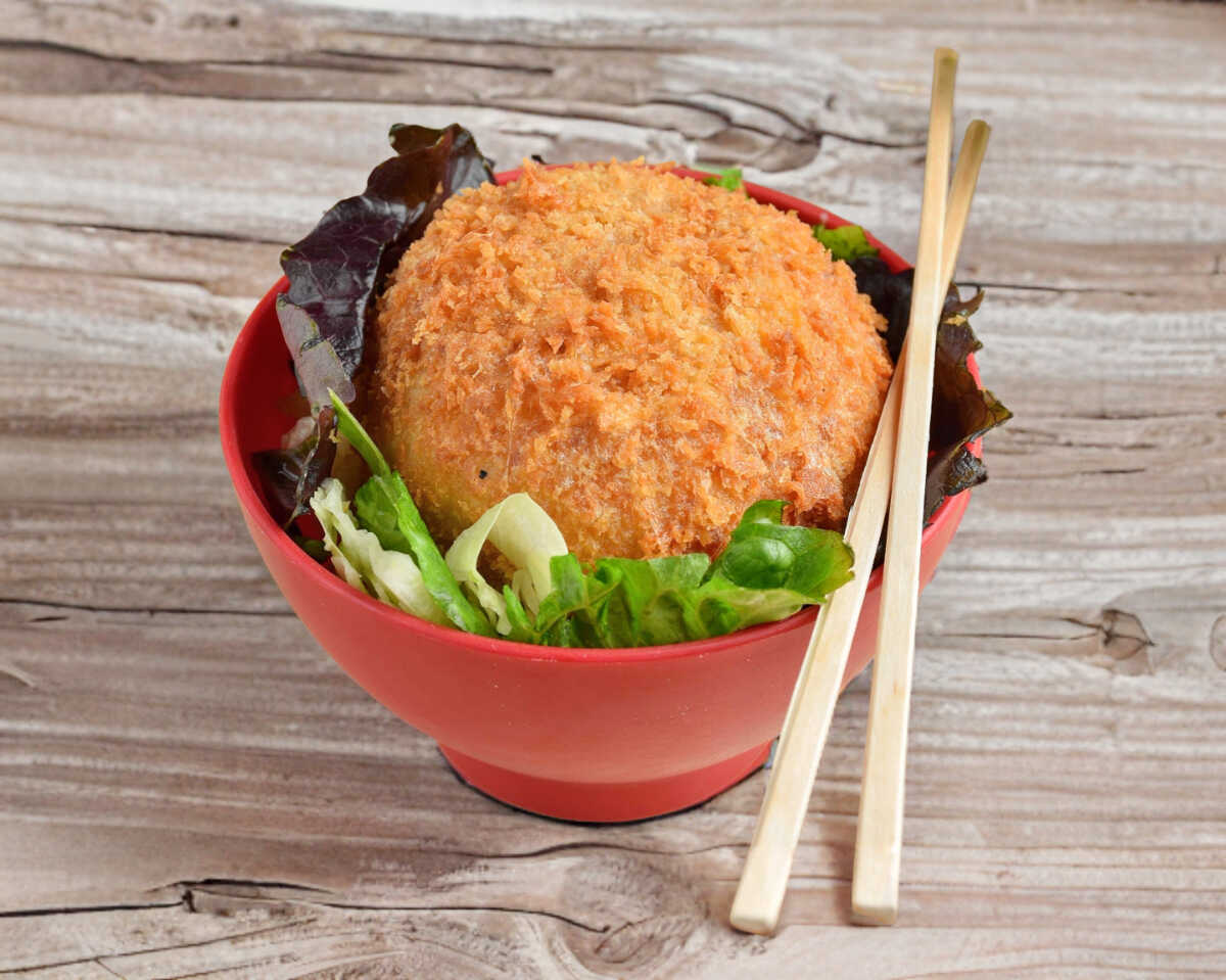Bolita de arroz empanizada rellena de aguacate, queso crema y pasta Tampico elige una proteína pollo, camarón o filete.