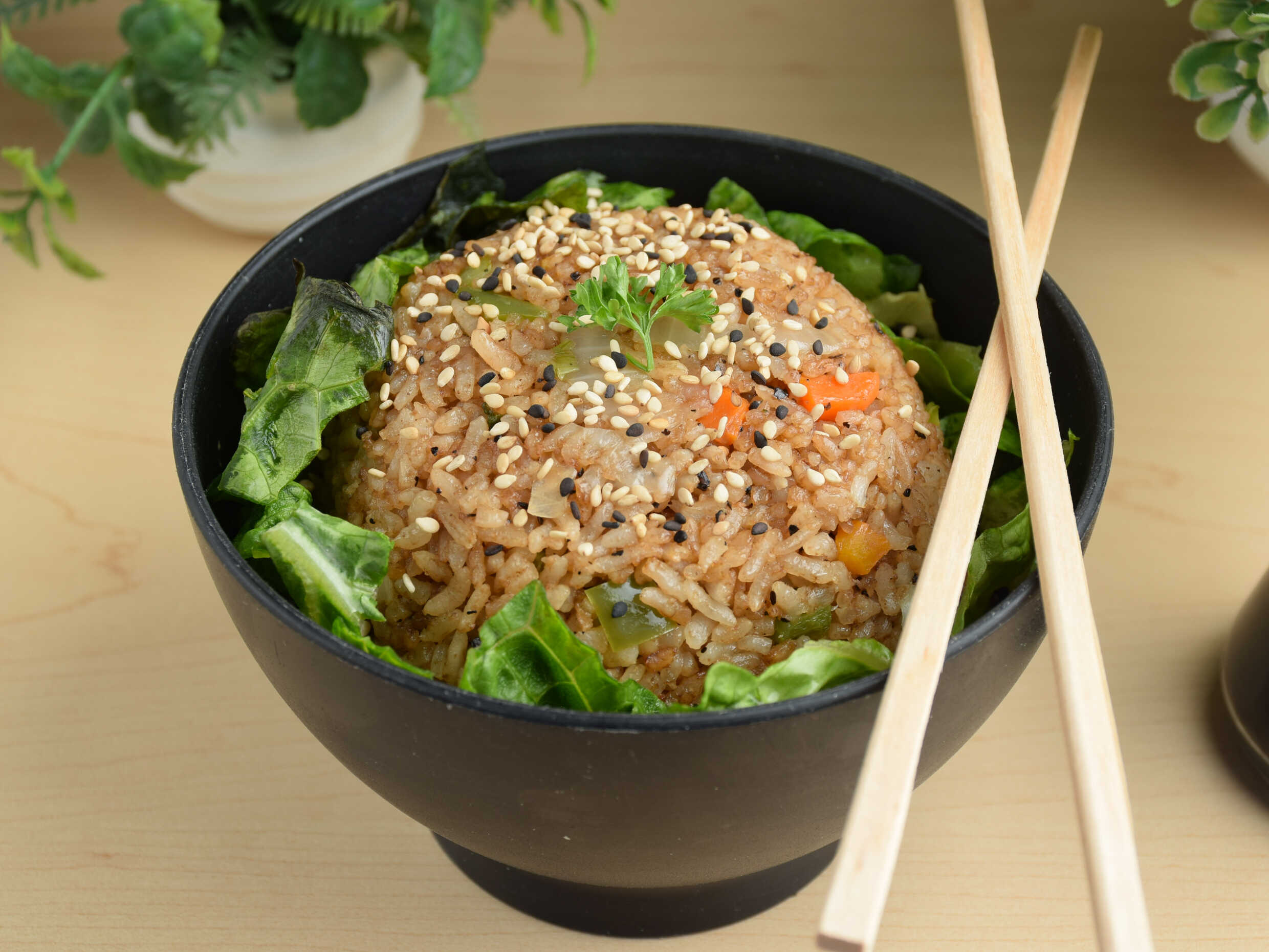 Arroz frito con verduras zanahoria, morrón y calabaza.