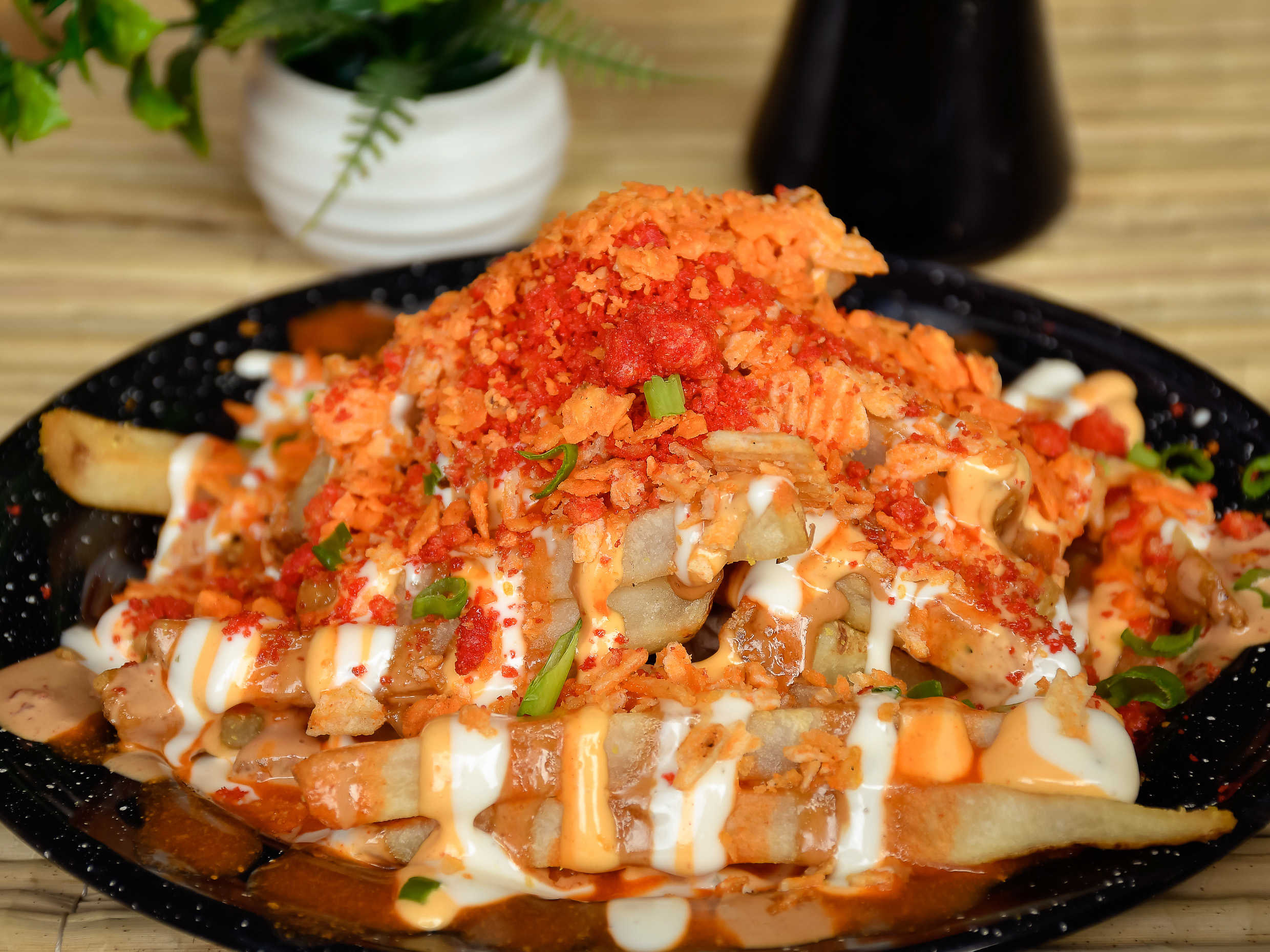 Papas a la francesa bañadas en 4 aderezos búfalo, chipotle, ranch y spicy espolvoreados con ruffles, chetos flaming hot y doritos.