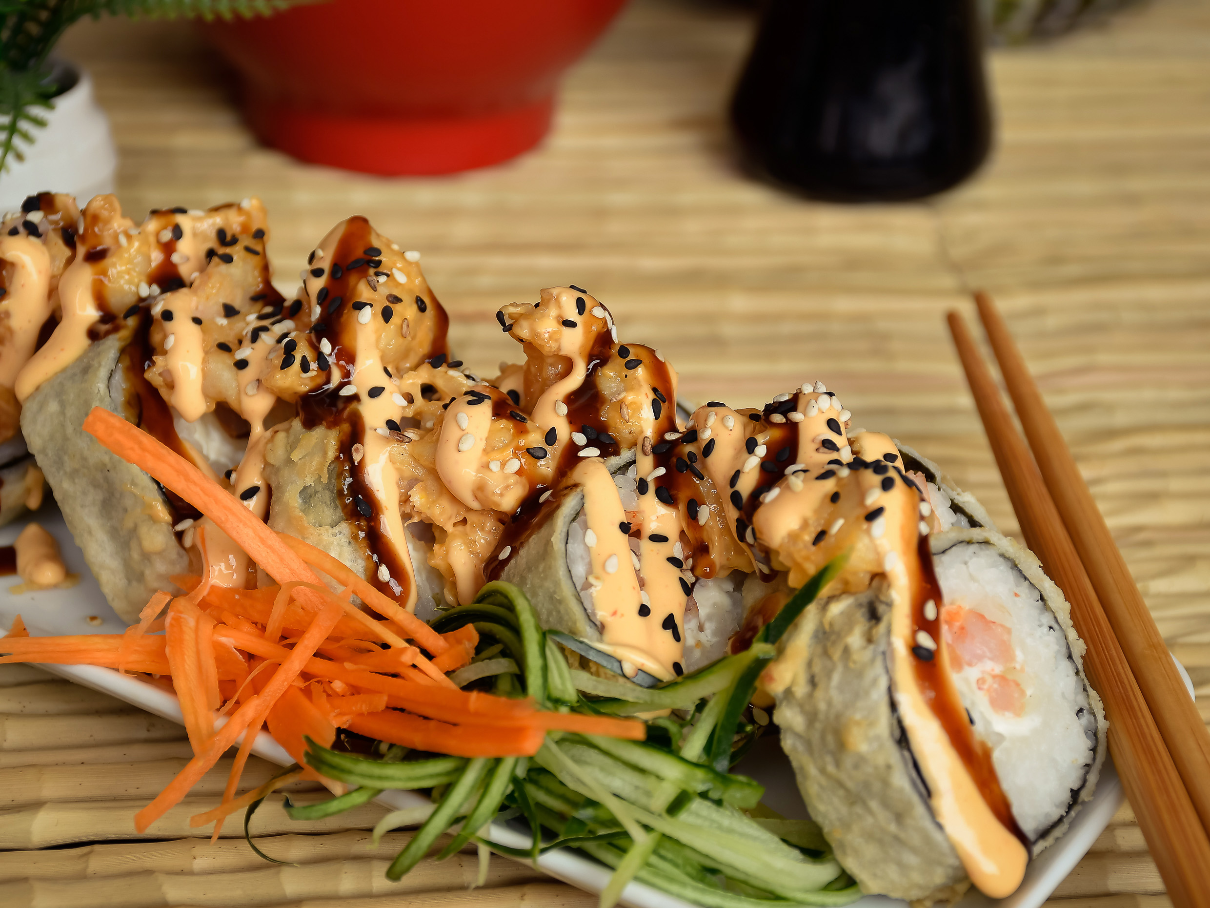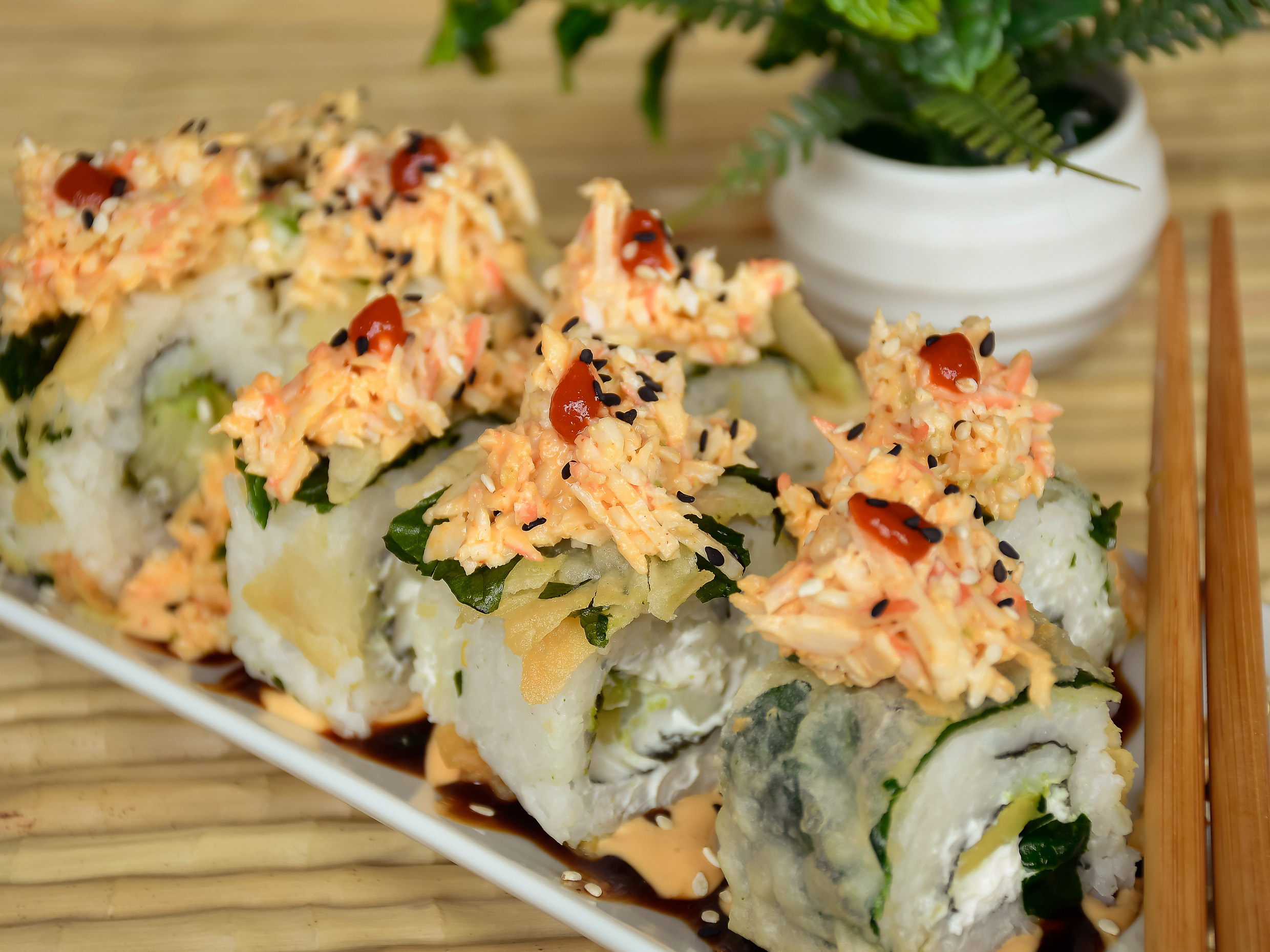 Rollo relleno de vegetales tempura crijientes, queso crema y pepino, cubierto por fuera con toping de verduras crunch spicy y salsa kushiague.