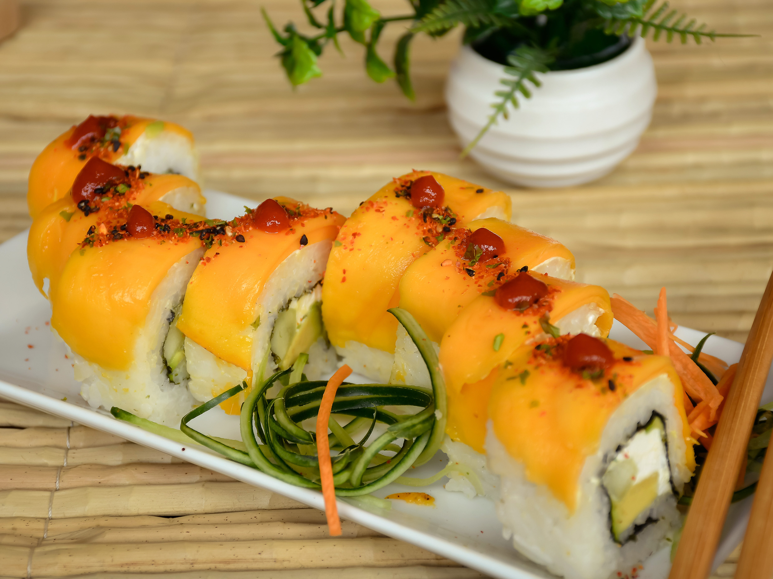 Rollo de queso crema, pepino, aguacate, encuelto en laminas de mango temporada.