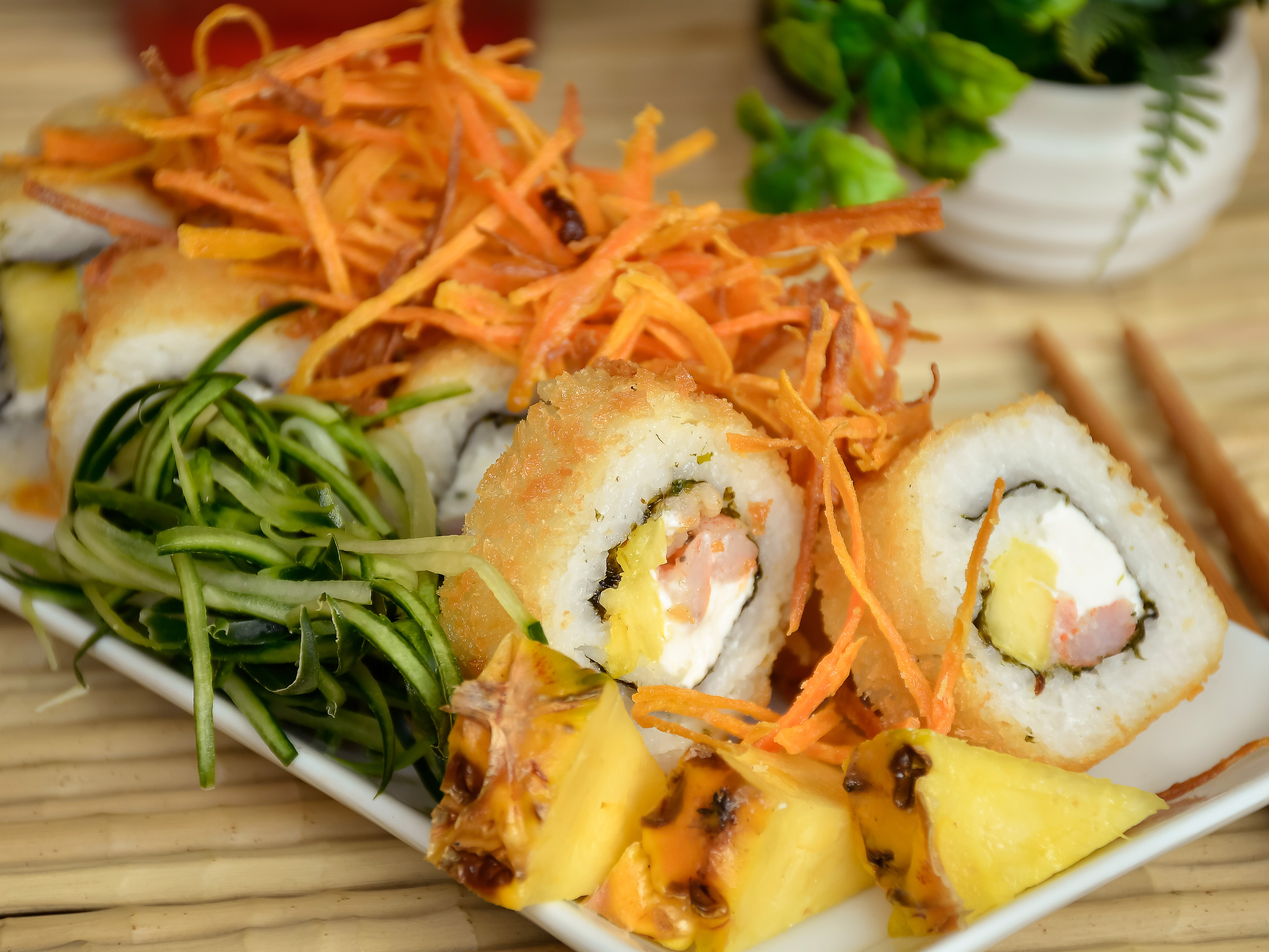 Rollo de pepino, zanahoria, morrón, piña, cubierto con kakiague.