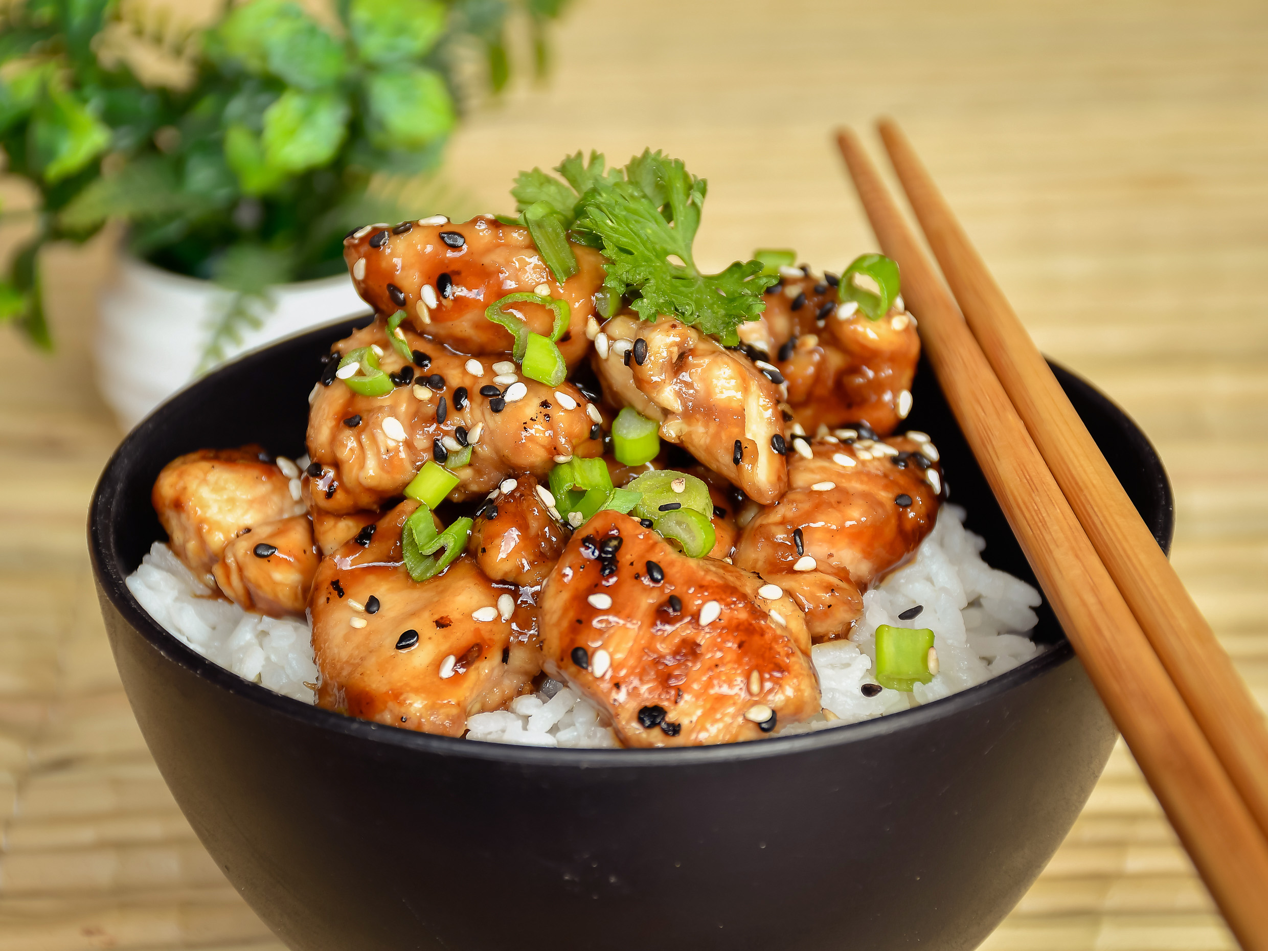 Trocitos de pollo tempura en salsa agridulce, cebollita asada, piña, zanahoria y ajonjolí, sobre una cama de arroz gohan.