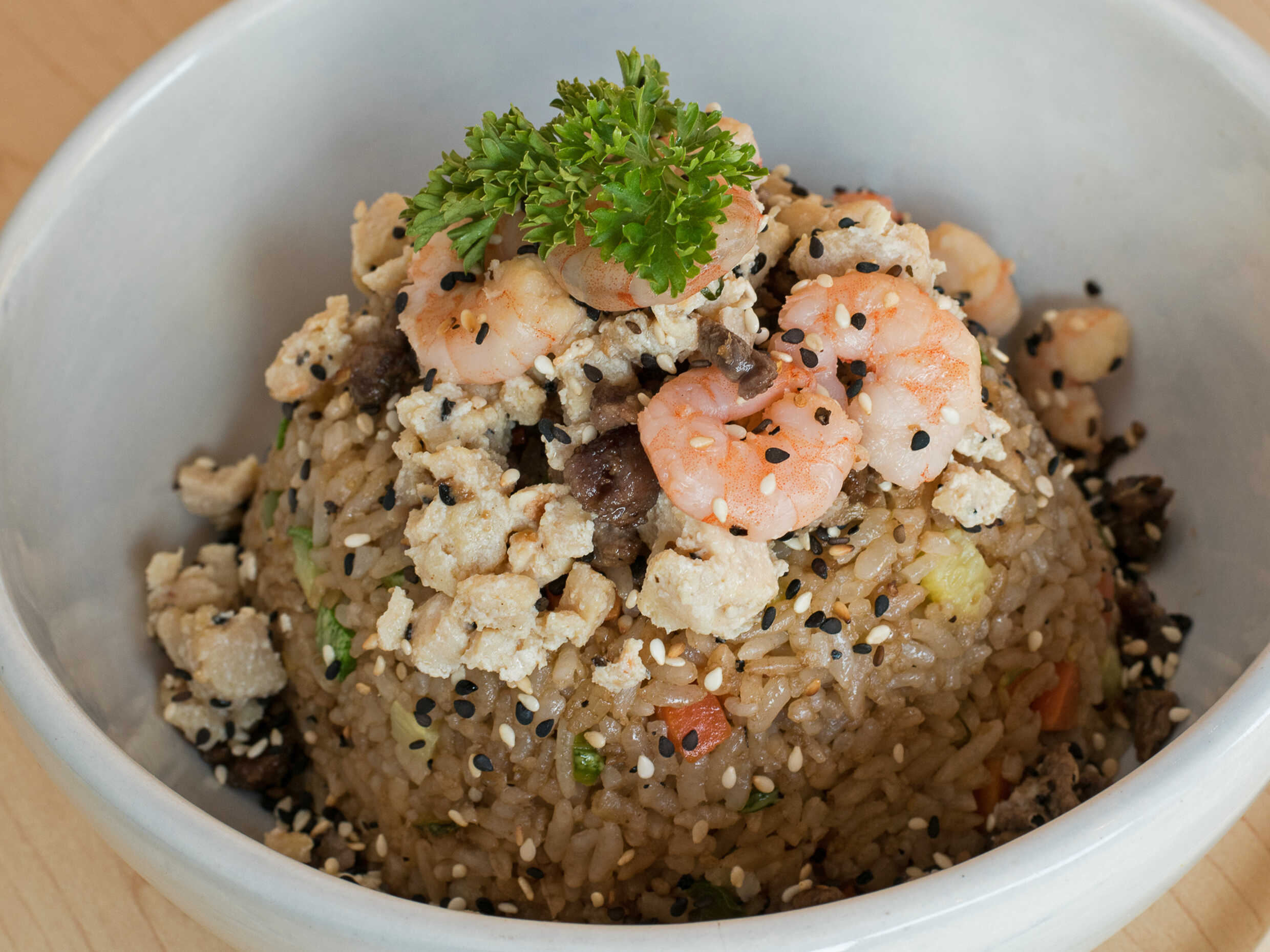 Arroz frito con verduras, pollo, camarón y filete.