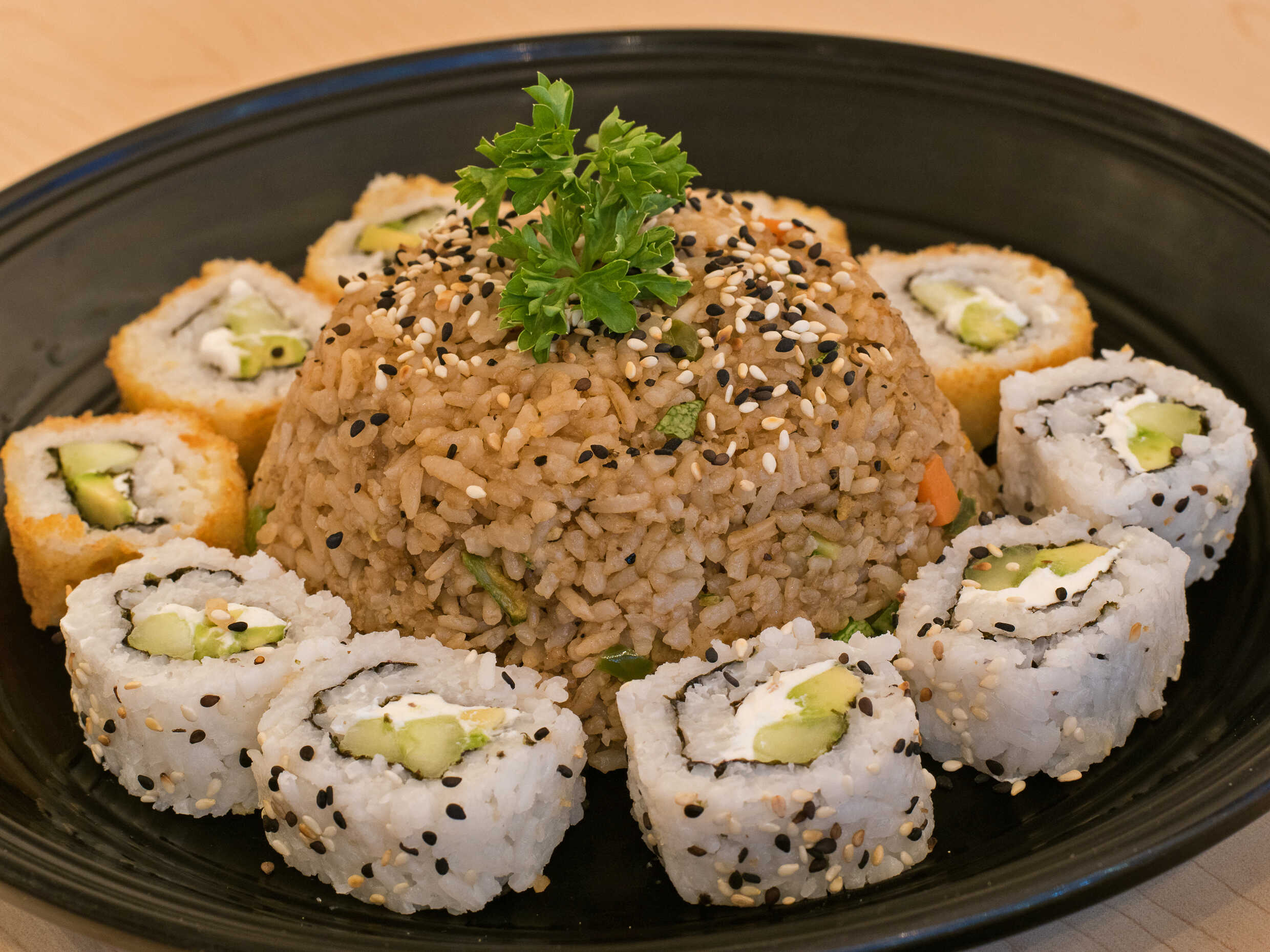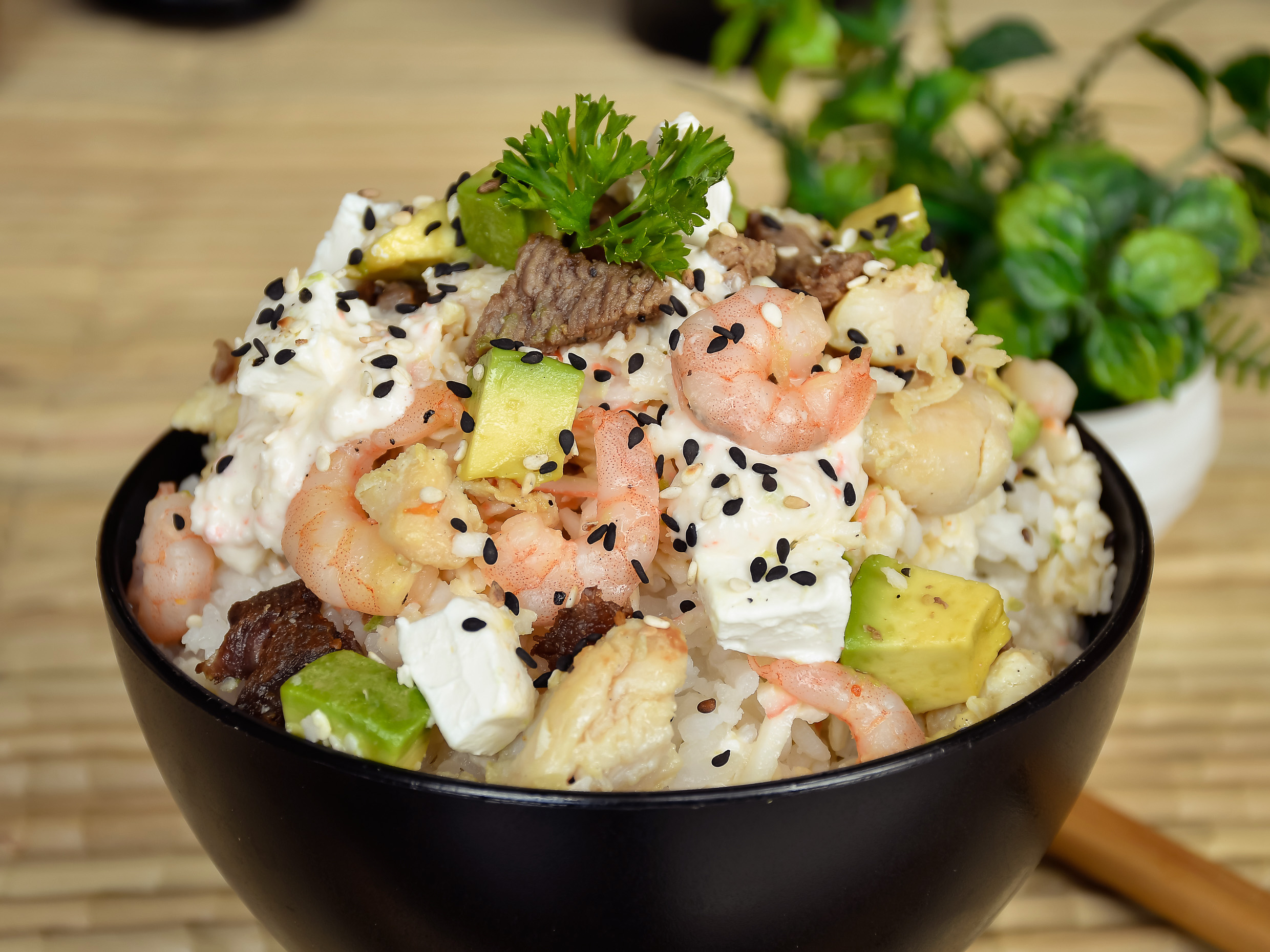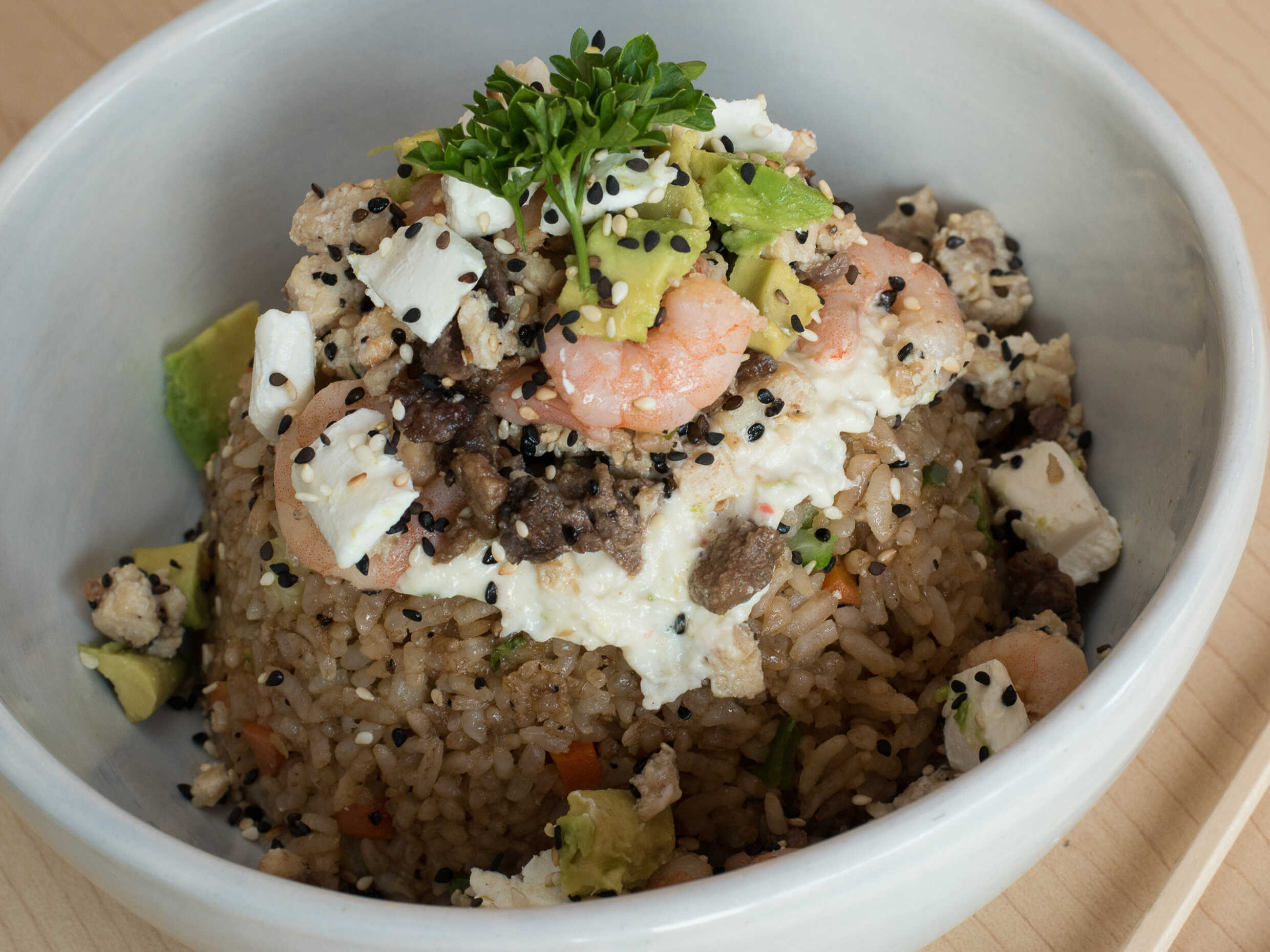 Arroz frito con verduras, pollo, camarón, filete, queso crema y aguacate.
