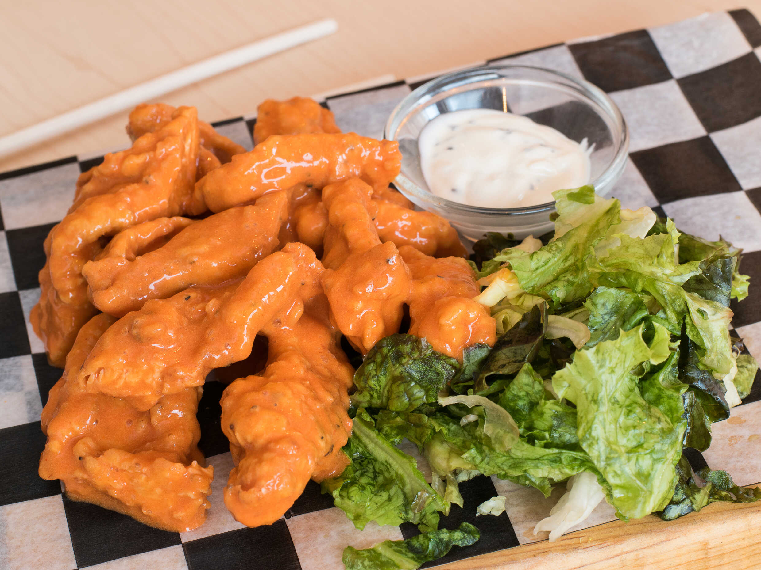 Lechuga, zanahoria picante rallada, tiritas de pechuga de pollo empanizadas y bañadas en salsa búfalo.