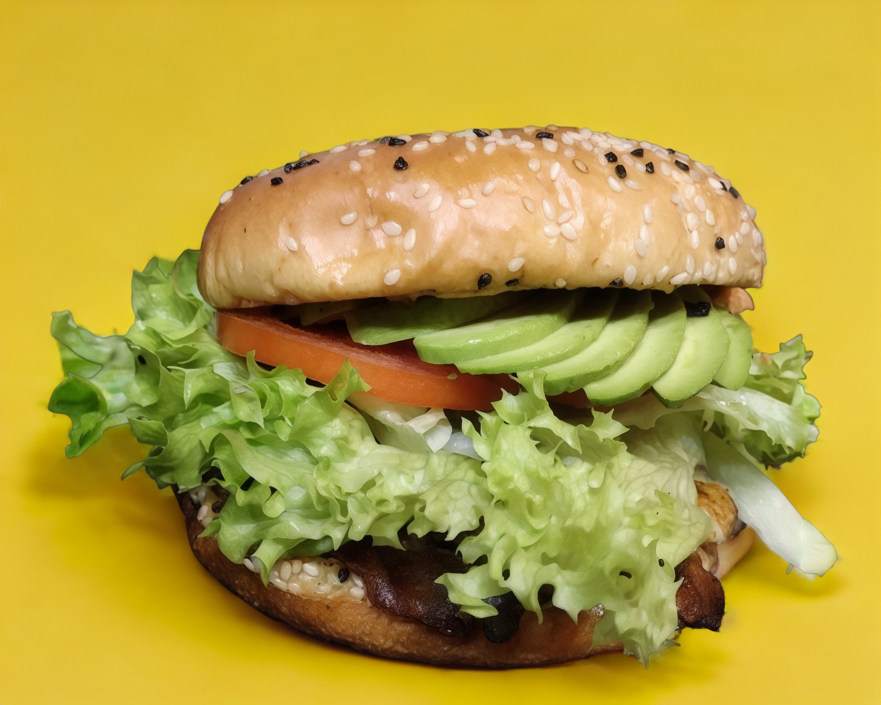 Hamburguesa con carne de atún aleta amarilla, guacamole, aderezo chipotle, costra queso mozzarella, lechuga hidropónica, tomate y cebolla caramelizada.