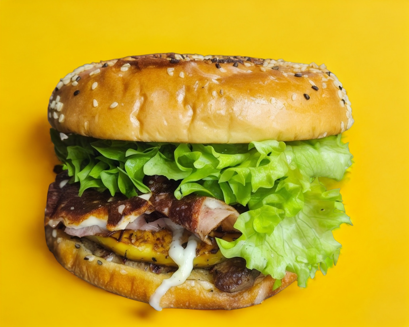 Carne 100% de res, costra de queso mozzarella, lechuga hidropónica, tomate, piña asada, jamón y cebolla asada