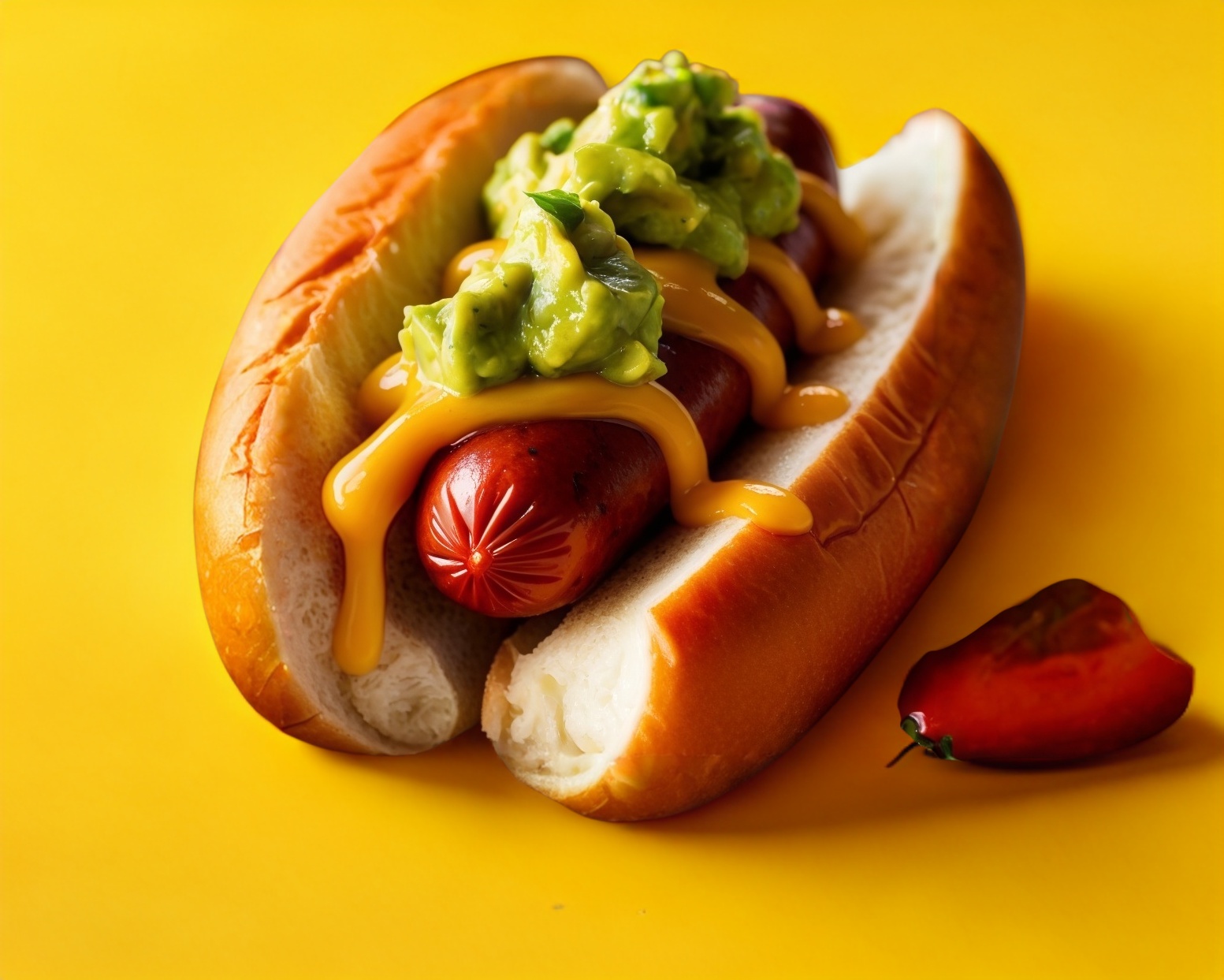 Salchicha para asar rellena de queso con guacamole, cebolla caramelizada y chile toreado.