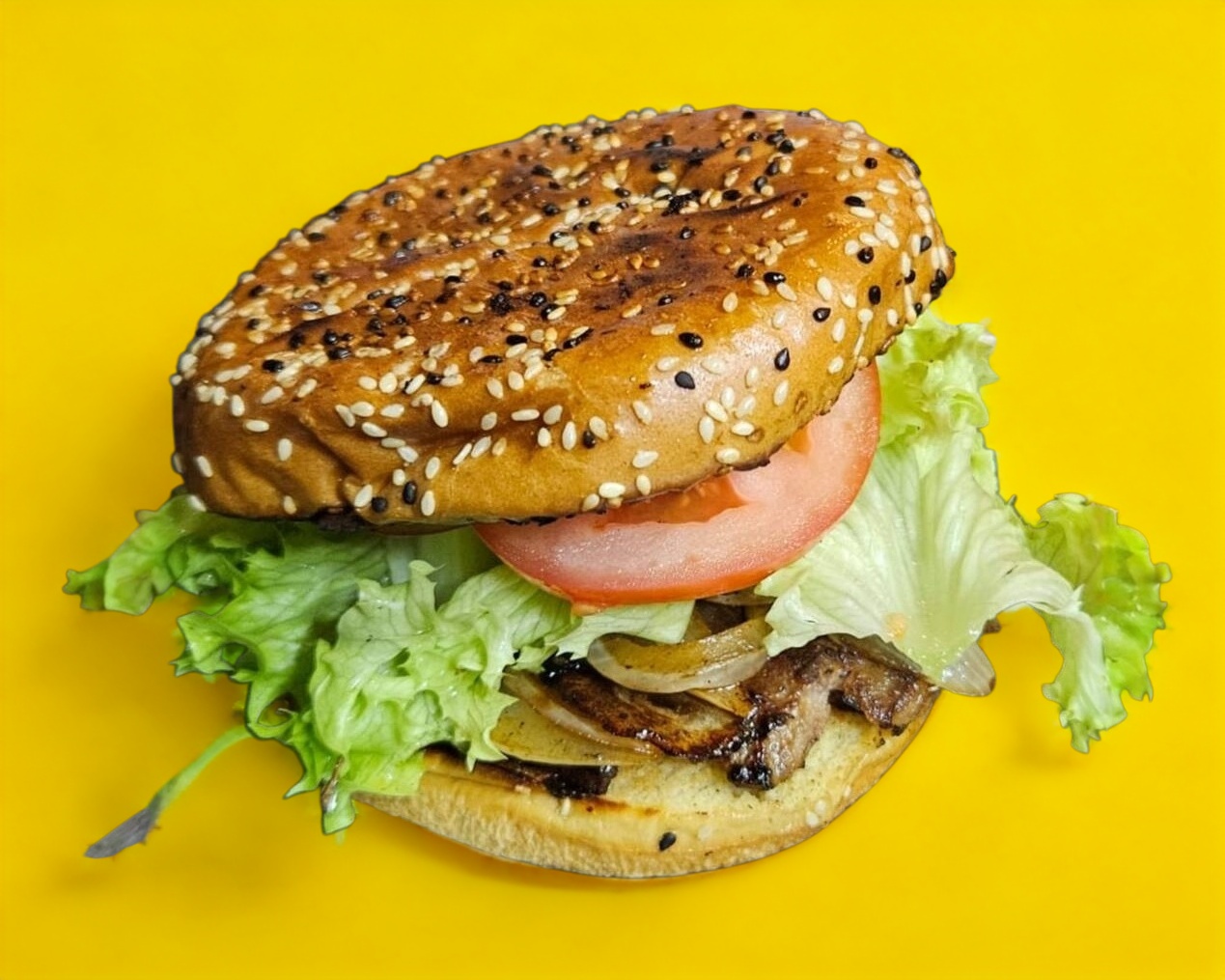 Carne 100% res, costra queso mozzarella, lechuga hidropónica, tomate y cebolla caramelizada.